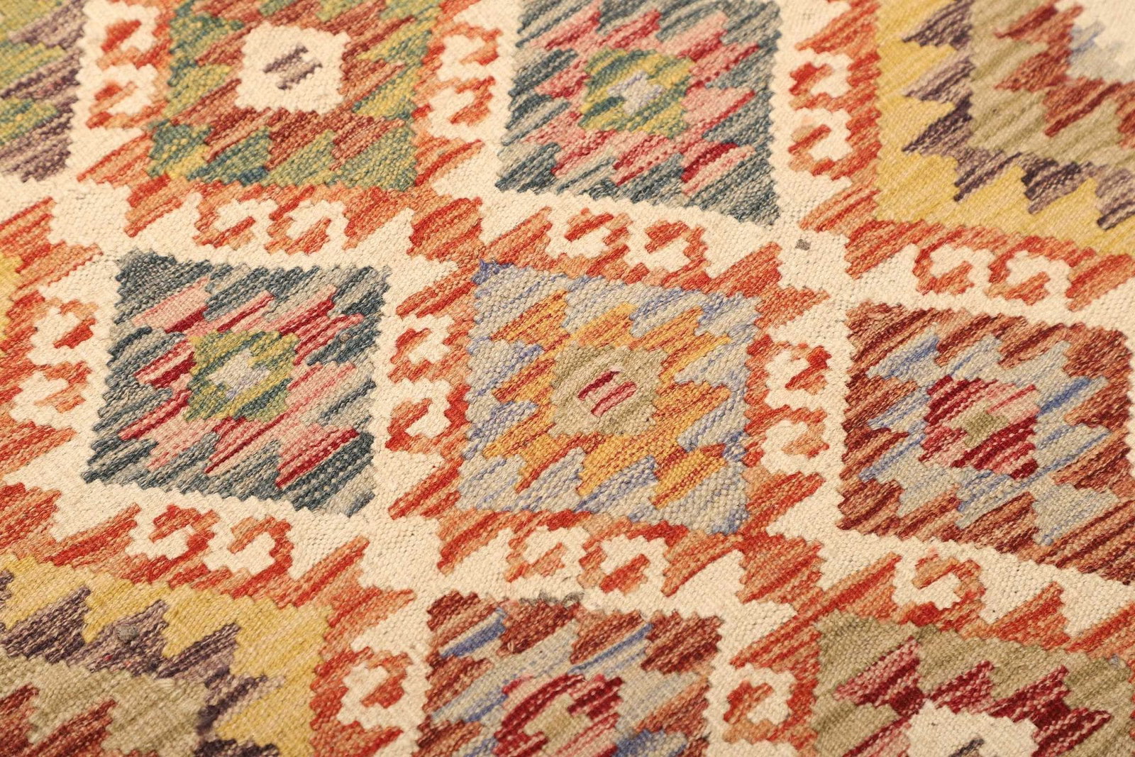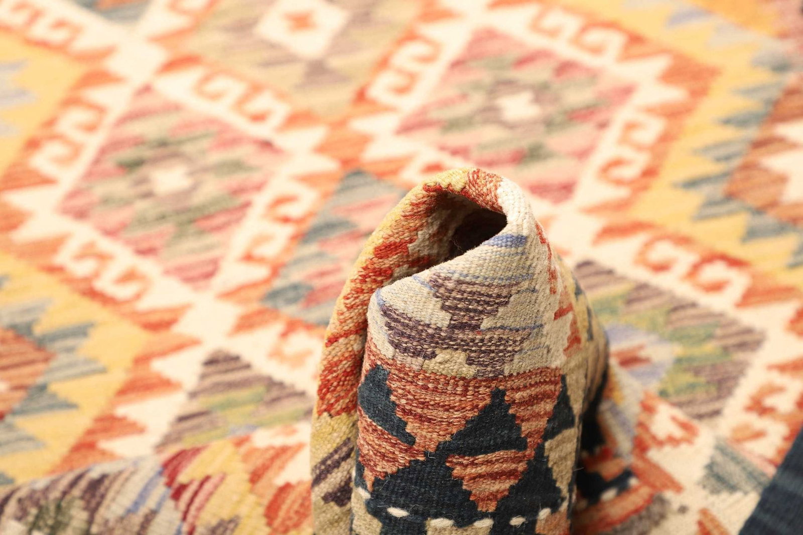 Der Kelim Teppich wurde aus hochwertigen Materialien gefertigt, die eine lange Lebensdauer garantieren. Bei der Herstellung wird reines Schafwollgarn verwendet, welches für seine Robustheit und Weichheit bekannt ist. Das handgewebte Verfahren sichert die Qualität jedes einzelnen Knotens und macht den Teppich langlebig sowie pflegeleicht. Die sorgfältige Verarbeitung der Kanten sorgt dafür, dass der Teppich auch unter alltäglichen Bedingungen nicht ausfranst oder Schäden aufweist.