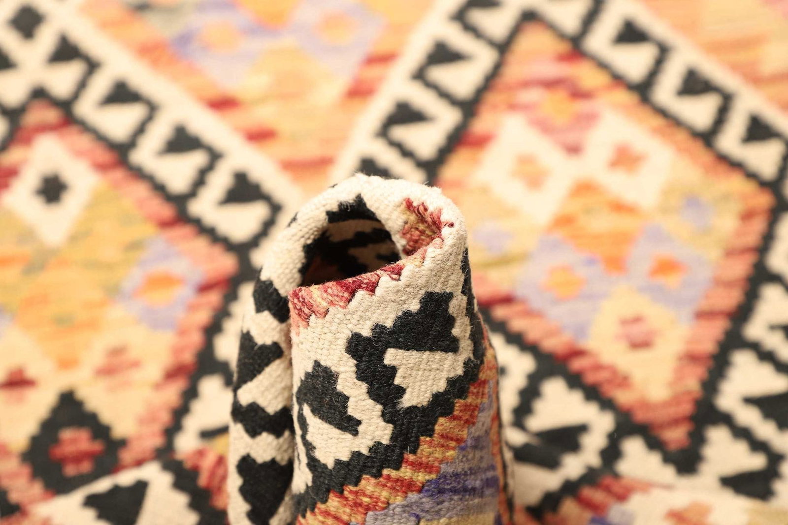 Der Kelim Teppich wird aus reiner Wolle gefertigt, die für ihre Strapazierfähigkeit und Langlebigkeit bekannt ist. Wolle bietet zudem eine natürliche Wärmedämmung, schafft ein angenehmes Raumklima und ist schmutzabweisend. Dieses Material sorgt dafür, dass der Teppich auch in stark frequentierten Räumen, wie dem Wohnzimmer oder Flur, lange schön bleibt. Die handgewebte Technik, die zur Herstellung dieses Teppichs verwendet wird, garantiert eine hohe Knotendichte, die sich in der Robustheit und der Detailgenauigkeit der Muster widerspiegelt. Handgewebte Teppiche zeichnen sich durch ihre individuelle Note aus und machen jeden Teppich zu einem Unikat.