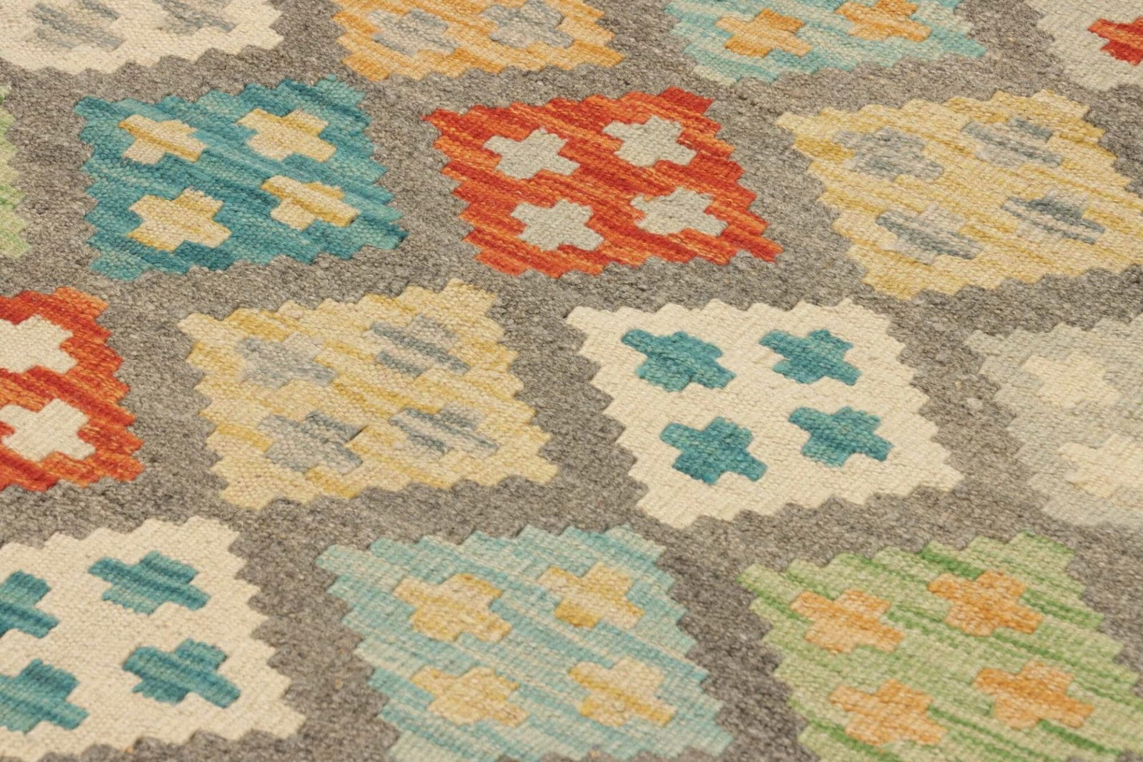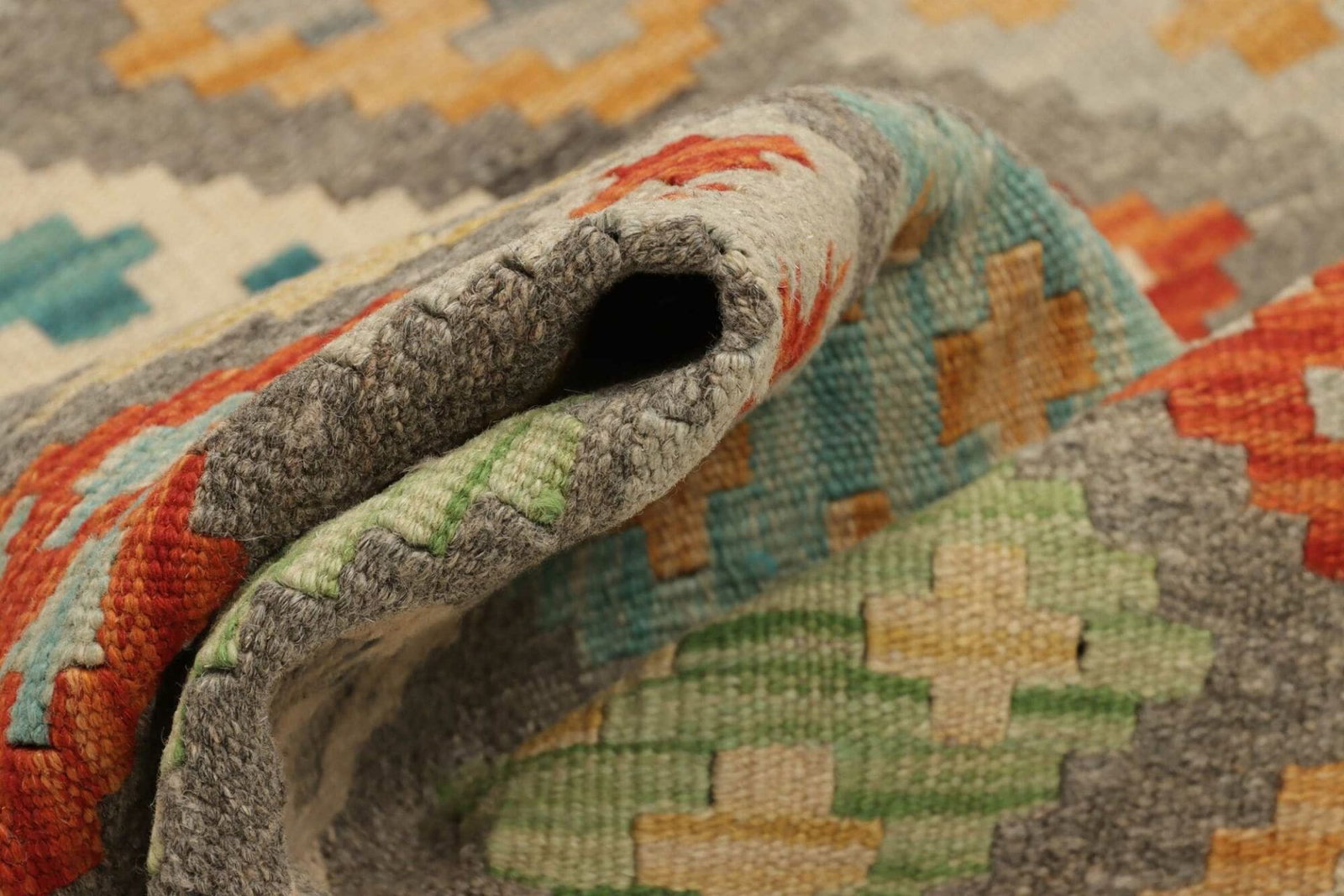 Der Teppich besteht aus reiner Wolle, die ihm eine einzigartige Weichheit und Wärme verleiht. Wolle hat zudem den Vorteil, dass sie schmutzabweisend und feuchtigkeitsregulierend ist, was den Teppich besonders pflegeleicht macht. Handgewebte Teppiche wie dieser Kelim sind in der Regel wenig anfällig für Abnutzung, da sie aus robusten Materialien hergestellt werden. Die Knotendichte und die präzise Verarbeitung sprechen für die hohe Qualität dieses Produkts, wodurch der Teppich nicht nur zur Dekoration, sondern auch als langlebiges Möbelstück in Ihrem Zuhause dient.