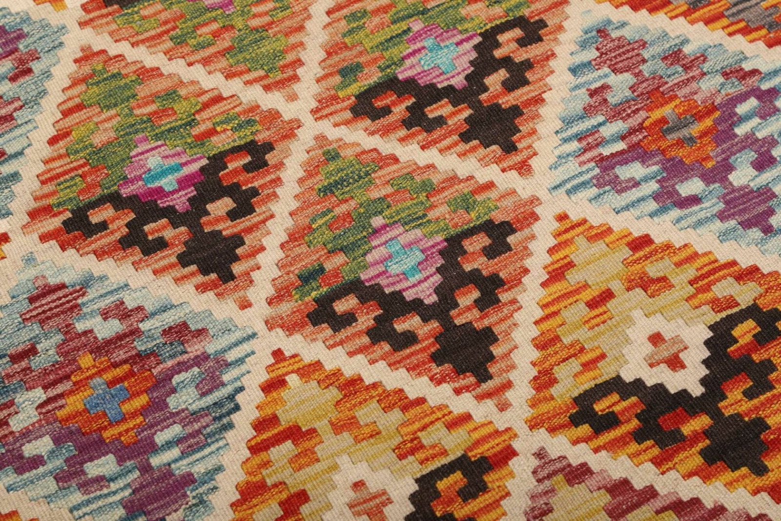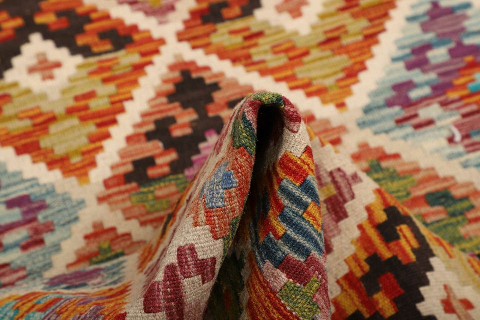 Der Kelim Teppich besteht aus hochwertiger Wolle, die nicht nur für ihre Strapazierfähigkeit bekannt ist, sondern auch ein angenehmes Fußgefühl vermittelt. Die Wahl des Materials trägt wesentlich zur Langlebigkeit des Teppichs bei. Wolle hat natürliche schmutzabweisende Eigenschaften und ist zudem isolierend, wodurch der Teppich sowohl im Sommer als auch im Winter eine angenehme Fußwärme bietet. Die handgewebte Technik garantiert, dass jede Fliese mit Sorgfalt und Präzision ausgeführt wurde. So wird nicht nur die Qualität, sondern auch die Authentizität des Teppichs unterstrichen.