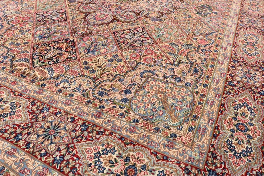 Handgeknüpfter Kerman Teppich | Knotendichte: 200.000 – 250.000 Knoten/m² | Material: Handgesponnene Wolle und Baumwollkette | Größe: 402×301 cm | Farbe: Multifarbe | Zustand: Neu | Ursprung: Iran / Persien | Dicke: ca. 10 mm | Gewicht: ca. 35 kg