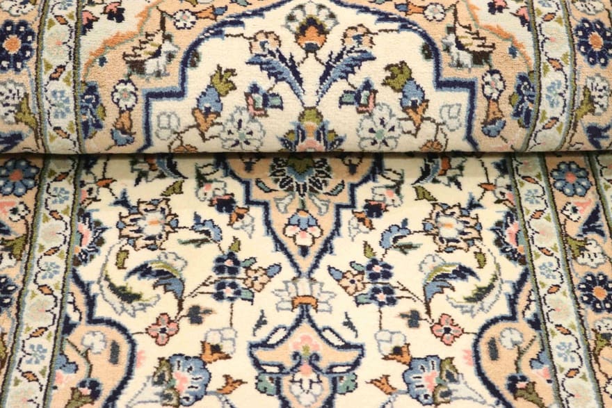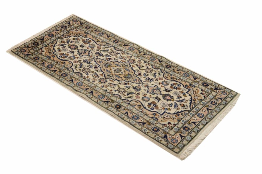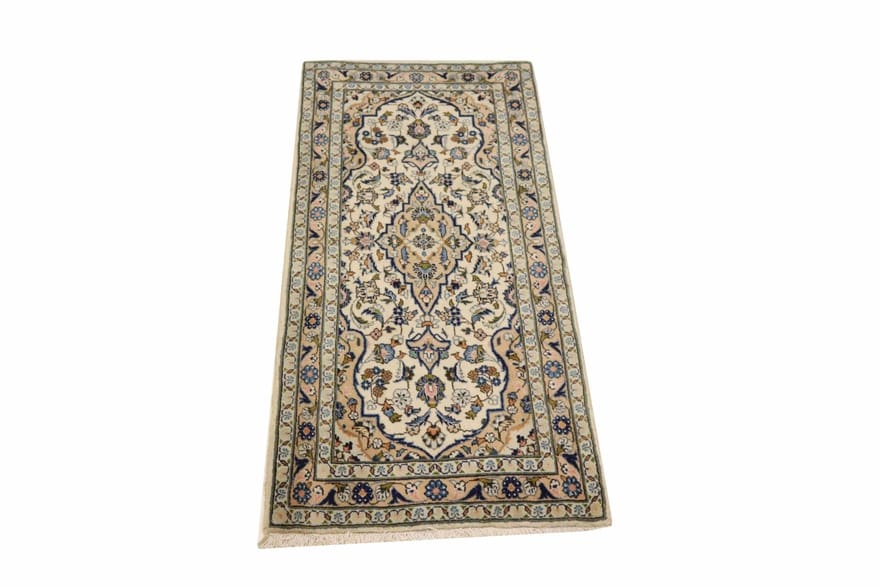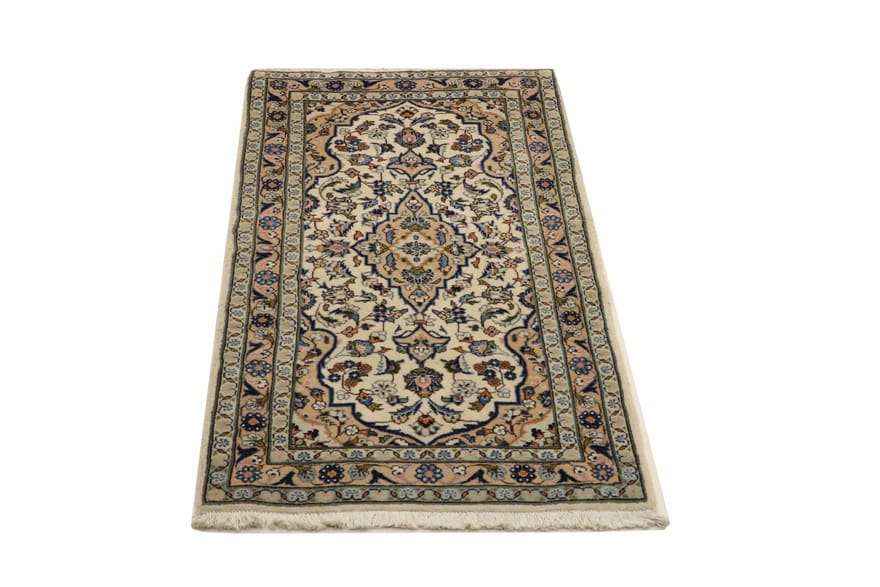 Handgeknüpfter Keschan Teppich | Knotendichte: 160.000 – 200.000 Knoten/m² | Material: Handgesponnene Wolle und Baumwolle | Größe: 172×74 cm | Farbe: Weiß/Beige | Zustand: Neu | Ursprung: Iran / Persien | Dicke: ca. 8 mm | Muster: Zentrales Medaillon mit floralen Motiven