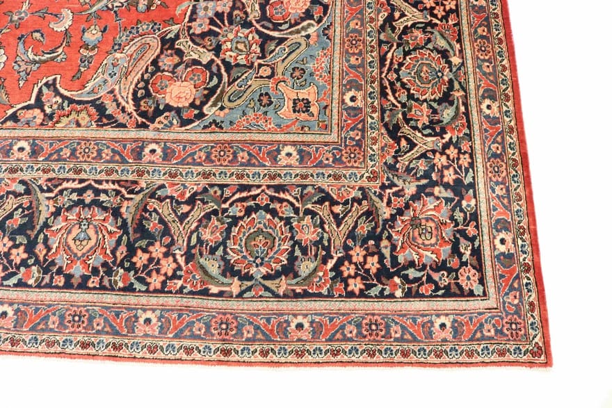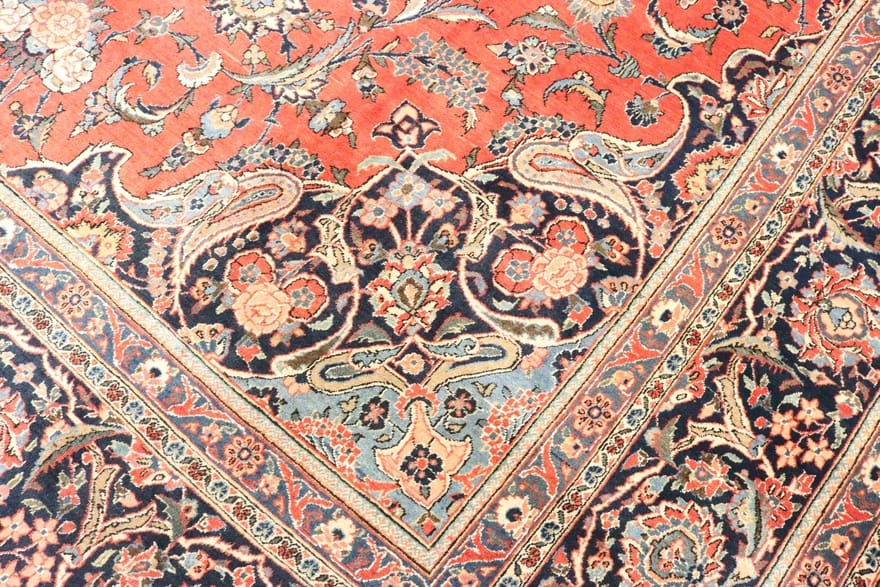 Antiker Keshan Teppich | Knotendichte: 200.000 – 250.000 Knoten/m² | Material: Wolle (Flor), Baumwolle (Kette) | Größe: 483×316 cm | Farbe: Rot/Orange | Form: Rechteckig | Zustand: Antik | Herkunft: Iran/Persien | Dicke: ca. 8 mm | Gewicht: ca. 45 kg | Verarbeitung: Handgeknüpft