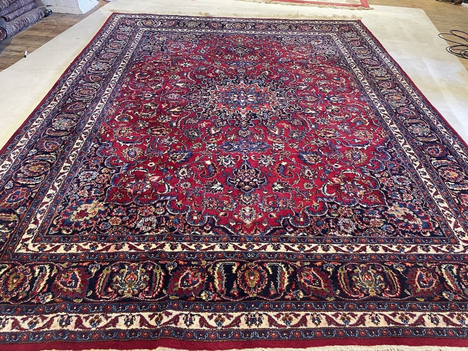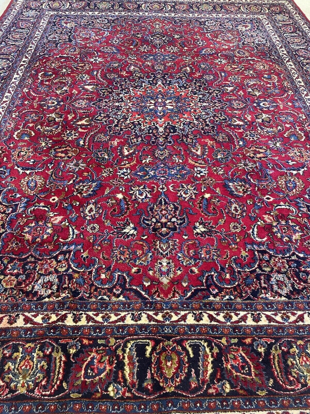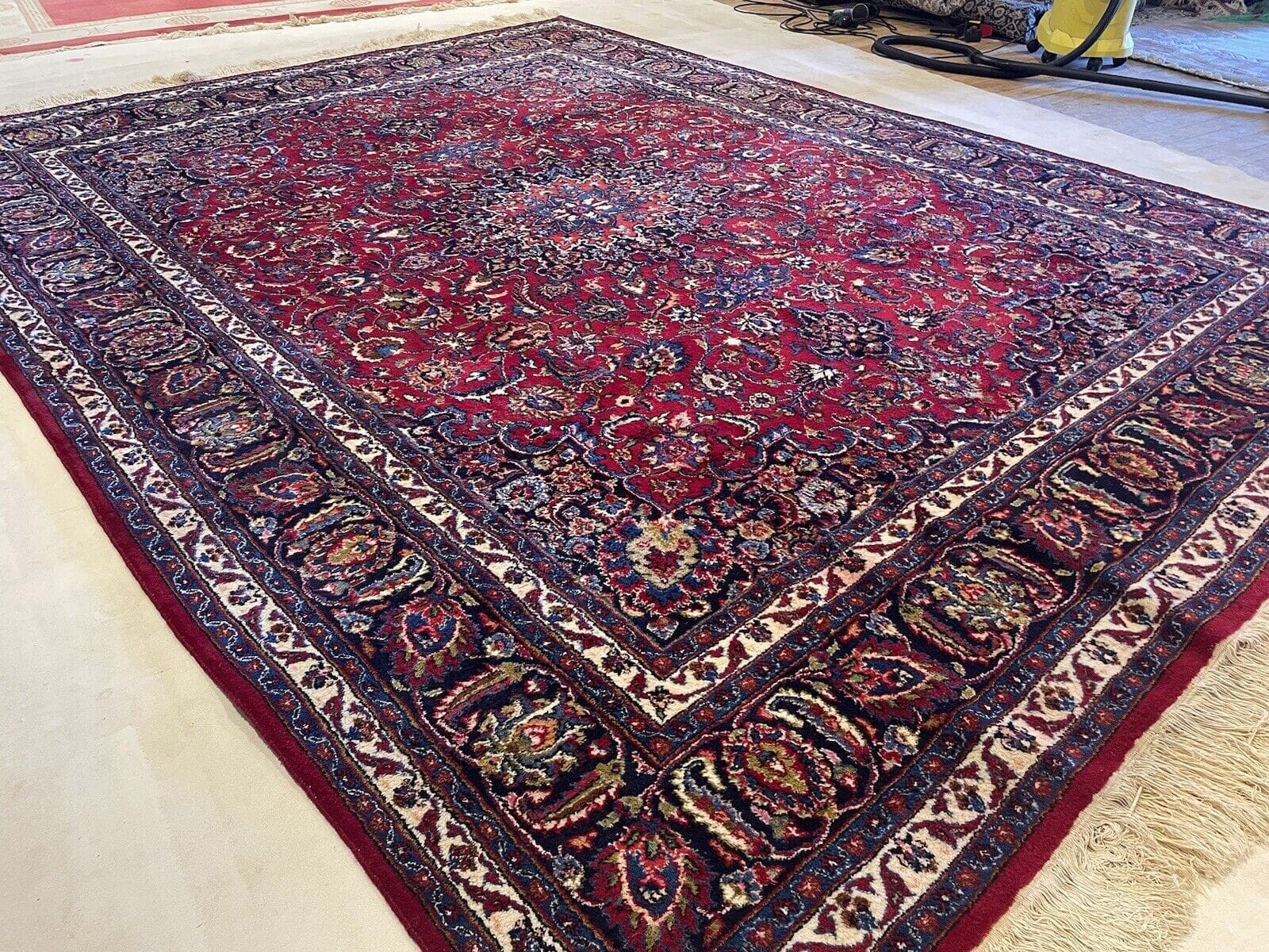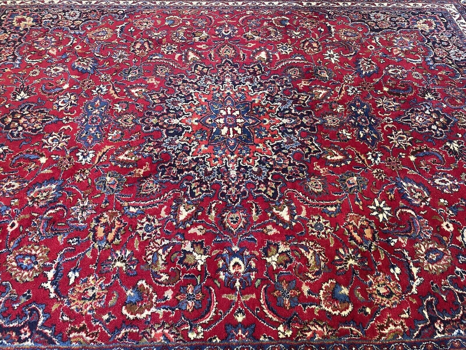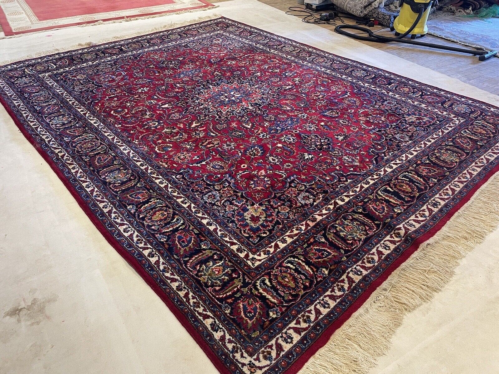 Klassischer Perserteppich | Handgeknüpft | Größe: 387×300 cm | Zustand: Neu ohne Etikett | Knotendichte: Hoch | Material: Wolle mit Baumwollkettfaden | Florhöhe: 8 mm | Muster: Geschwungene Ornamente im floralen Design | Farbe: Rot mit blauer Bordüre | Regionale Design: Mashad | Für Fußbodenheizung geeignet | Stil: Traditionell Persisch/Orientalisch