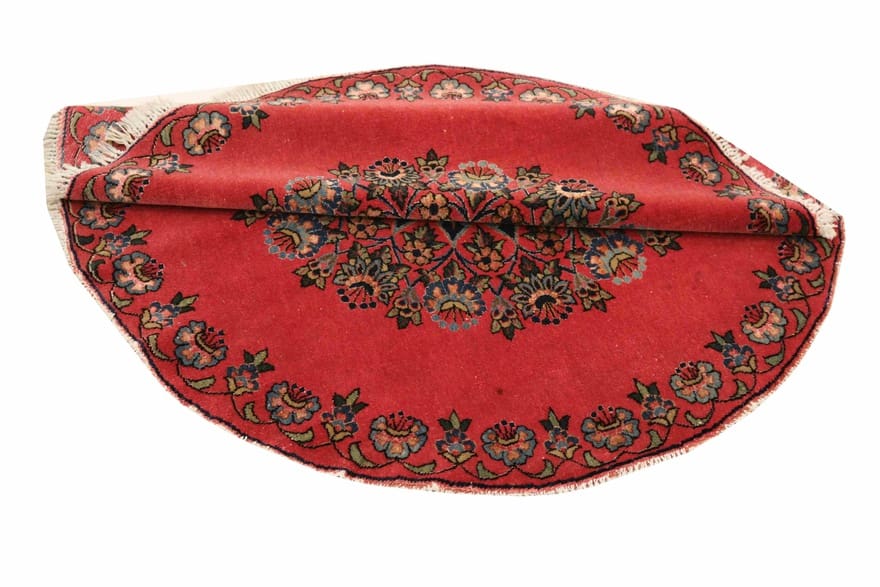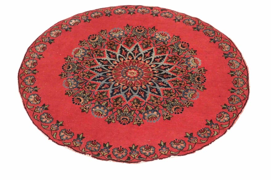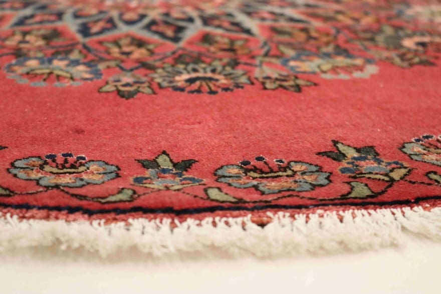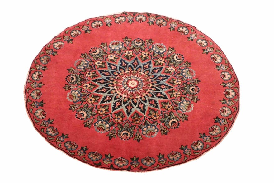 Antiker Keshan Teppich | Knotendichte: 440.000 – 490.000 Knoten/m² | Material: Wolle und Seide | Größe: 102×101 cm | Rundes Design mit zentralem Medaillon | In gutem Zustand | Ursprung: Iran / Persien | Verarbeitung: Handgeknüpft | Farbe: Rot/Orange | Dicke: ca. 6 mm | Gewicht: ca. 4 kg