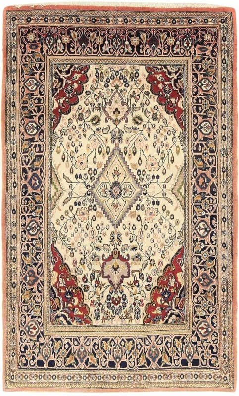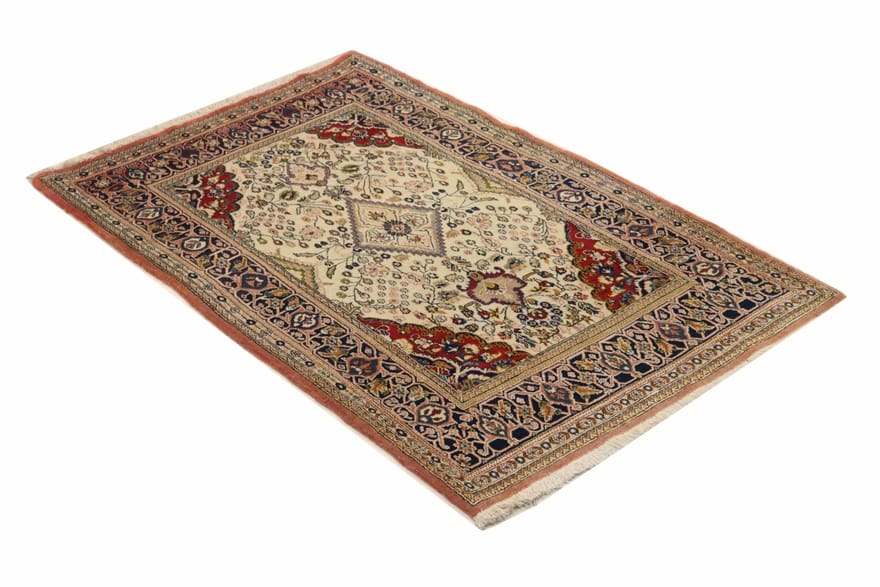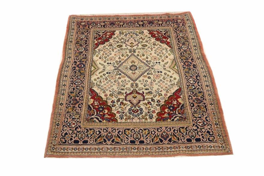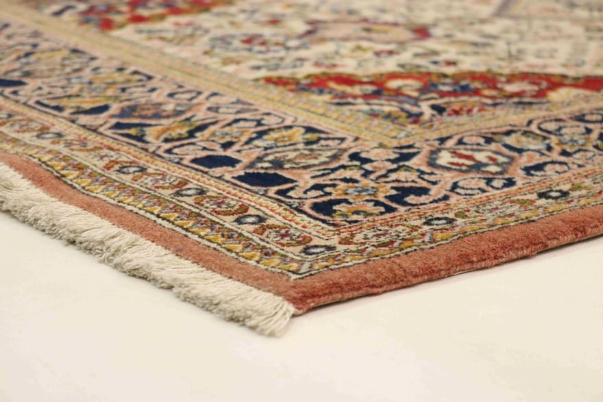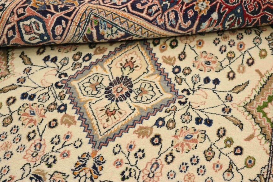 Keshan Teppich | Knotendichte: 320.000 – 360.000 Knoten/m² | Material: Handgesponnene Wolle und Baumwolle | Größe: 184×113 cm | In neuem Zustand | Farbe: Weiß/Beige | Ursprung: Iran/Persien | Rechteckige Form | Dicke: ca. 10 mm | Gewicht: ca. 6 kg