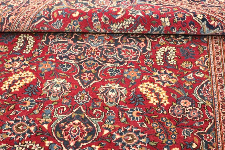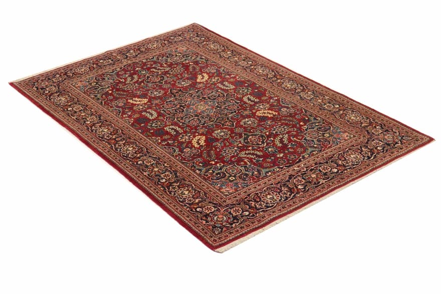 Keshan Teppich | Knotendichte: 440.000 – 490.000 Knoten/m² | Material: Handgesponnene Wolle und Baumwollkette | Größe: 216×138 cm | Farbe: Rot/Orange | Zustand: Antik | Ursprung: Iran/Persien | Verarbeitung: Handgeknüpft