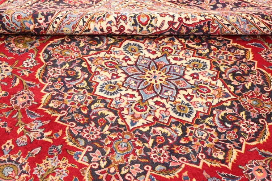 Typisch für Teppiche aus Keshan sind elegante Medaillons und seitliche Bordüren, die mit feinen Detailarbeiten verziert sind. Diese charakteristischen Elemente machen den Teppich sofort erkennbar und verleihen jedem Raum eine besondere Note.