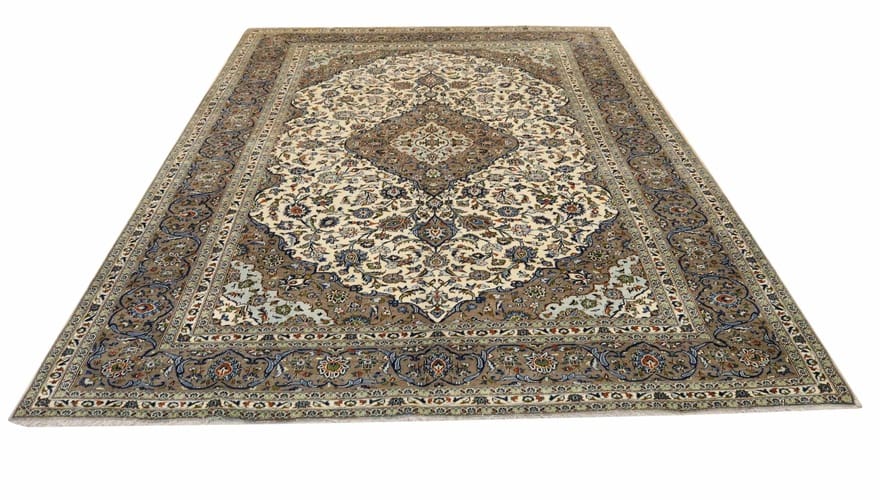 Keshan Teppich | Knotendichte: 160.000 – 200.000 Knoten/m² | Material: Handgesponnene Wolle | Größe: 400×299 cm | In neuzeitlichem Zustand | Herkunft: Iran / Persien | Verarbeitung: Handgeknüpft | Dicke: ca. 10 mm | Gewicht: ca. 30 kg | Farbe: Weiß/Beige | Muster: Zentrales Medaillon umgeben von floralen Motiven