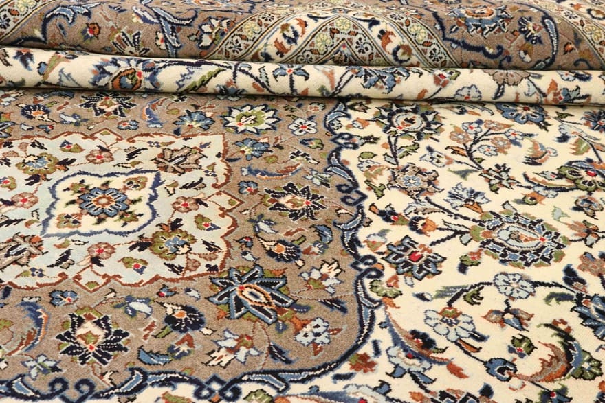 Echte Keshan Teppiche zeichnen sich durch die hohe Knotendichte und die Verwendung von Naturfasern aus. Prüfen Sie auch die Rückseite des Teppichs; bei handgeknüpften Teppichen sind die Muster oft auf der Rückseite sichtbar und die Qualität des Kunstwerks spiegeln sich wider.