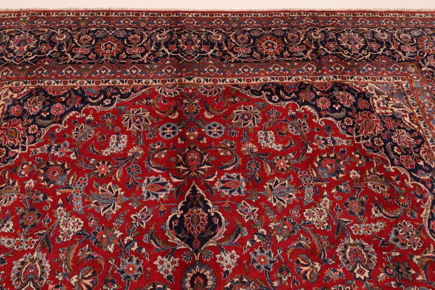 Keshan Teppich | Knotendichte: 128.000 – 160.000 Knoten/m² | Material: Wolle und Seide | Größe: 427×321 cm | Farbe: Rot/Orange | Zustand: Antik | Herkunft: Iran/Persien | Dicke: ca. 8 mm | Gewicht: ca. 40 kg | Verarbeitung: Handgeknüpft
