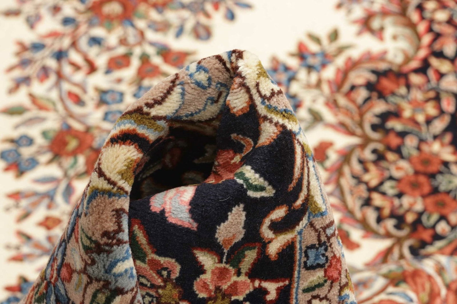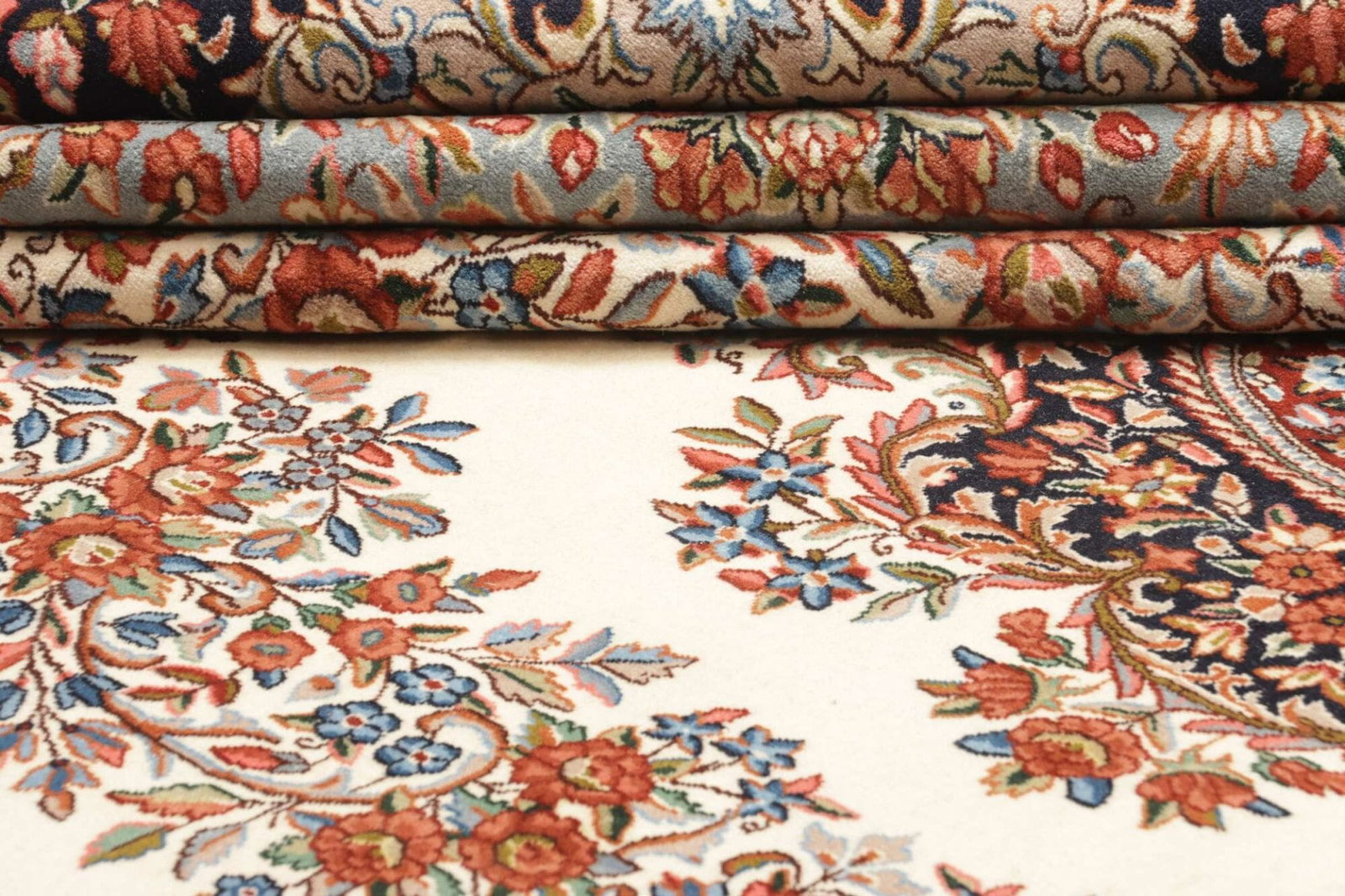 Der Kirman Orientteppich ist aus hochwertigen Materialien gefertigt, die sowohl Langlebigkeit als auch Ästhetik gewährleisten. Die Wolle, die für die Herstellung verwendet wird, sorgt für einen weichen Griff und eine angenehme Haptik, während die Farben lebendig und strahlend sind. Durch die handgeknüpfte Technik erreicht dieser Teppich eine bemerkenswerte Knotendichte, die nicht nur für einen hohen qualitativen Standard sorgt, sondern auch die Detailtreue des florale Musters auf hervorragende Weise zur Geltung bringt. Jeder Knoten wird mit größter Sorgfalt und Präzision ausgeführt, was zu einem langlebigen und zeitlosen Produkt führt.
