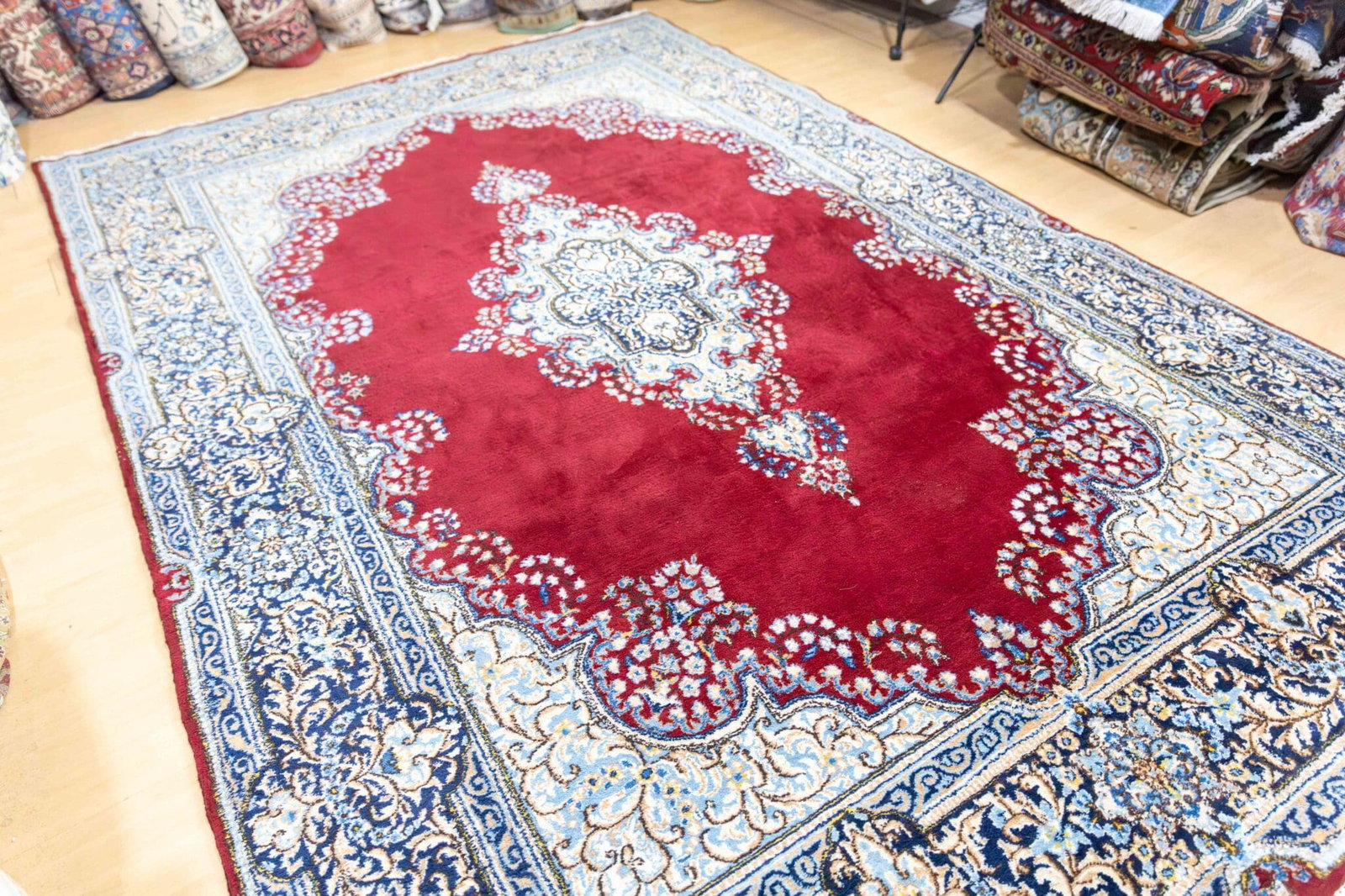 Wer einen echten Kirman-Teppich besitzt, erkennt den Unterschied sofort: die harmonische Tiefe der Farben, die klaren Konturen des Medaillons, die ruhige Struktur der Bordüren und die subtile Balance des gesamten Musters.
