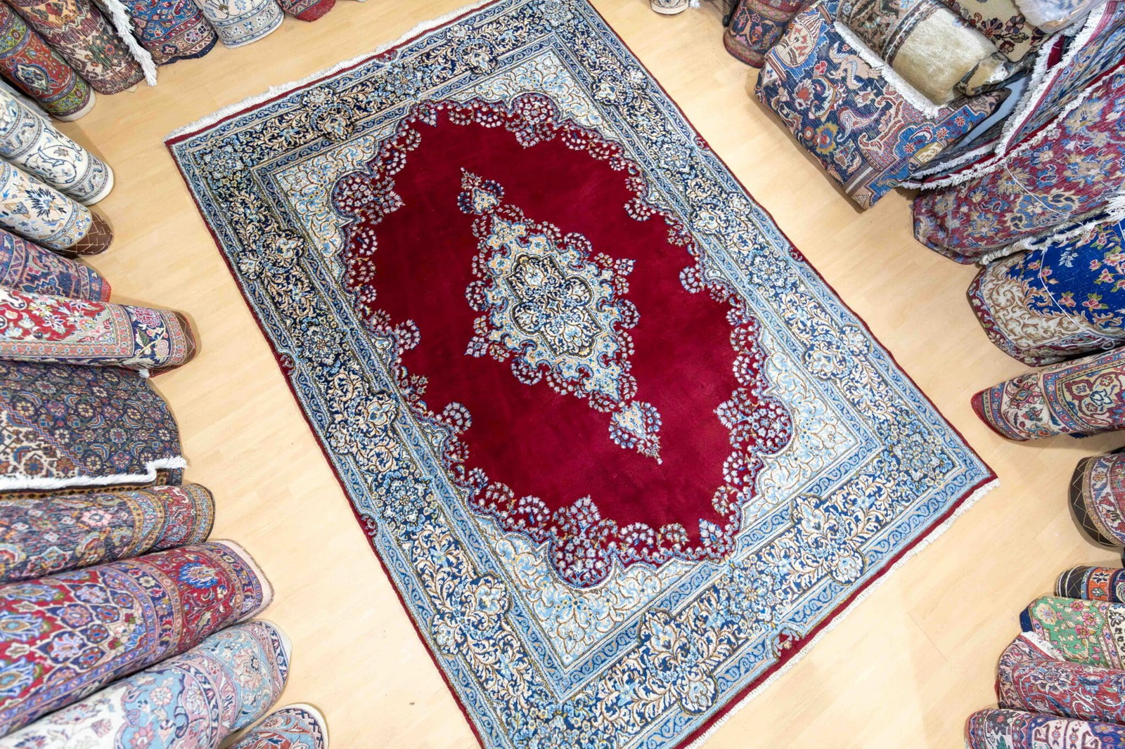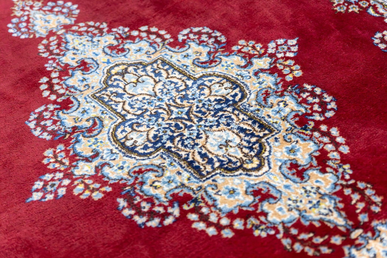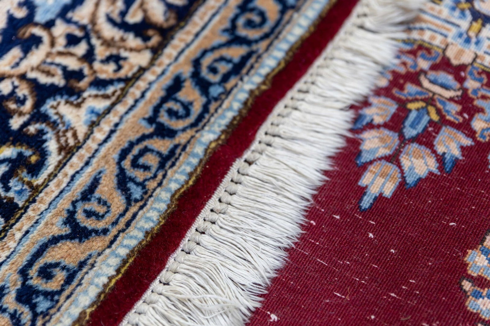 Ein echter handgeknüpfter Kirman-Teppich kann – bei richtiger Pflege – mehrere Generationen überdauern. Regelmäßiges leichtes Absaugen und gelegentliches professionelles Waschen genügen, um die Farben frisch und den Flor geschmeidig zu halten.