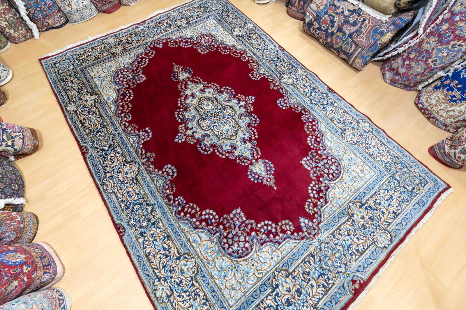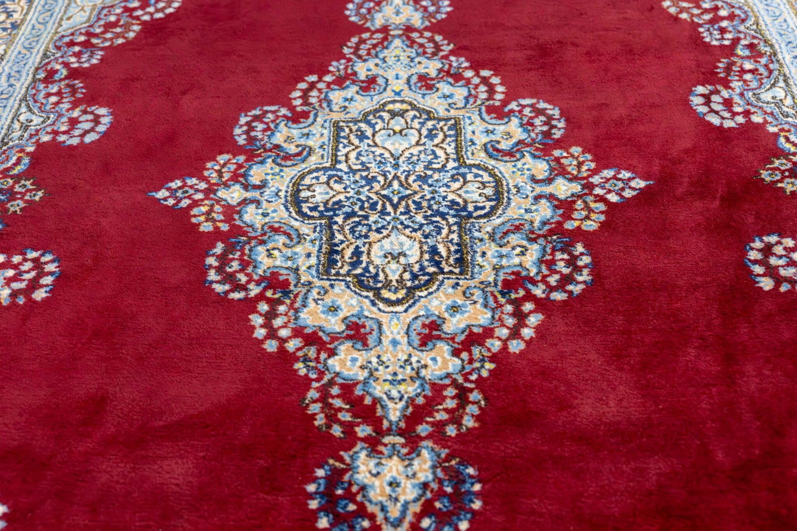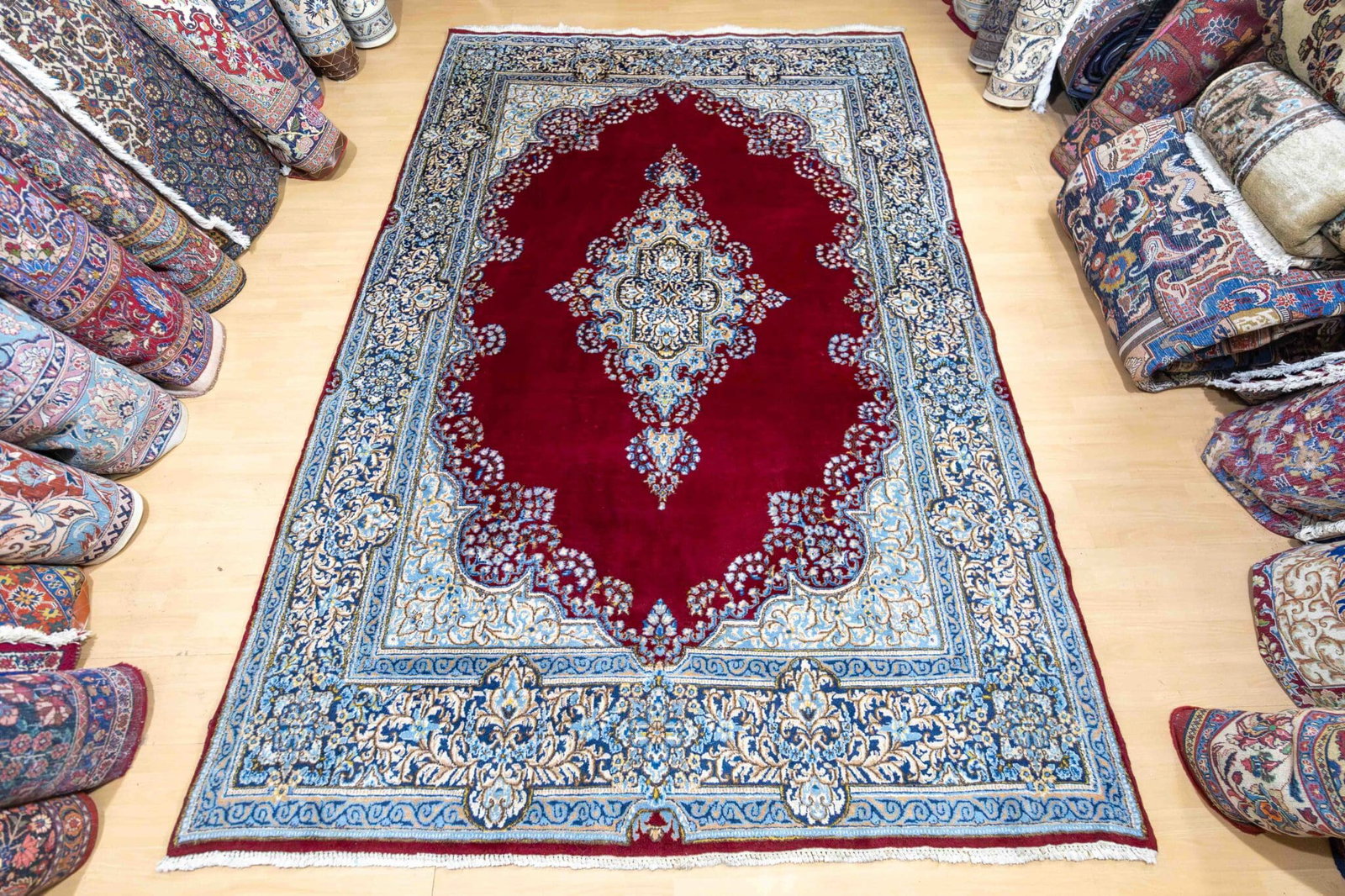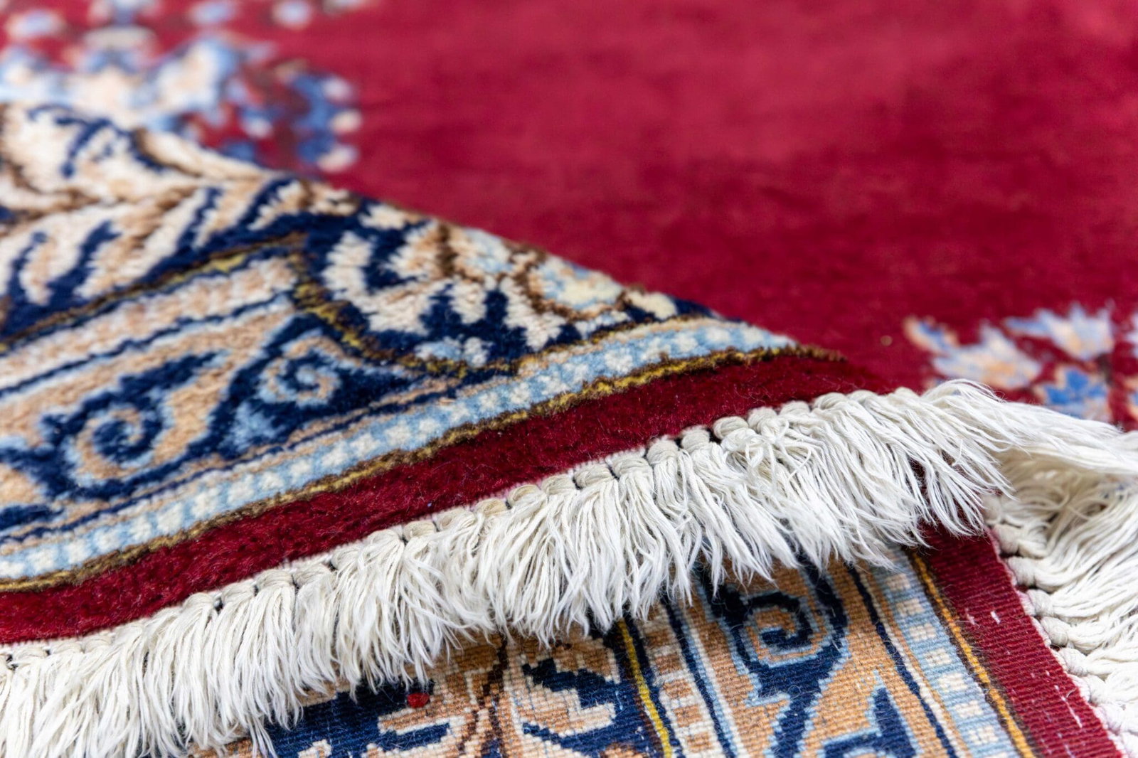 Ein echter handgeknüpfter Kirman-Teppich kann – bei richtiger Pflege – mehrere Generationen überdauern. Regelmäßiges leichtes Absaugen und gelegentliches professionelles Waschen genügen, um die Farben frisch und den Flor geschmeidig zu halten.