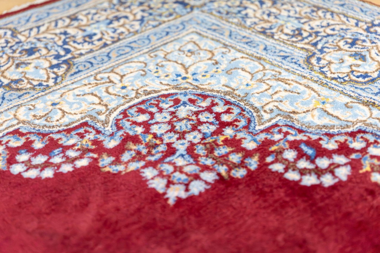 Der Teppich wurde mit einer außergewöhnlich hohen Knotendichte von etwa 300 000 Knoten pro Quadratmeter gefertigt. Diese Dichte verleiht ihm nicht nur ein fein detailliertes Muster, sondern auch eine bemerkenswerte Stabilität und Langlebigkeit. Die Oberfläche (der Flor) besteht aus hochwertiger Schurwolle auf einer Baumwollkette, was dem Teppich sowohl Weichheit als auch Formbeständigkeit gibt.