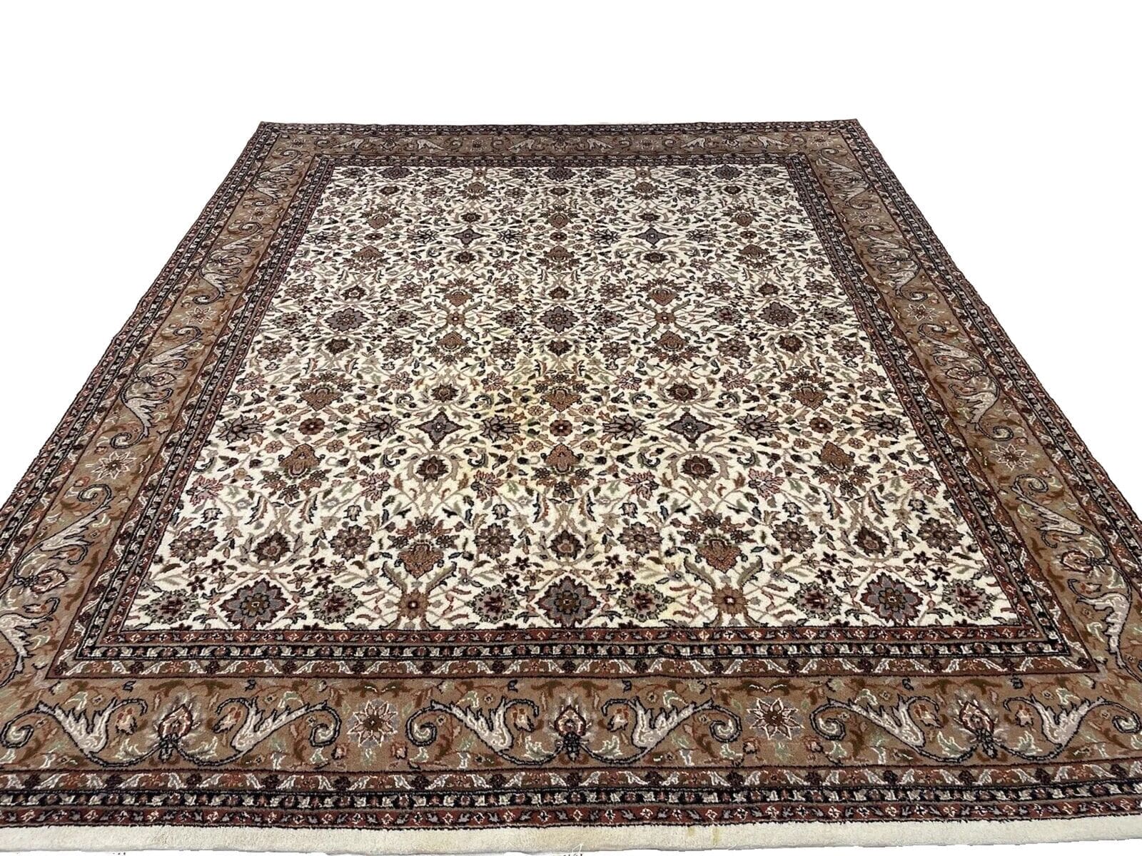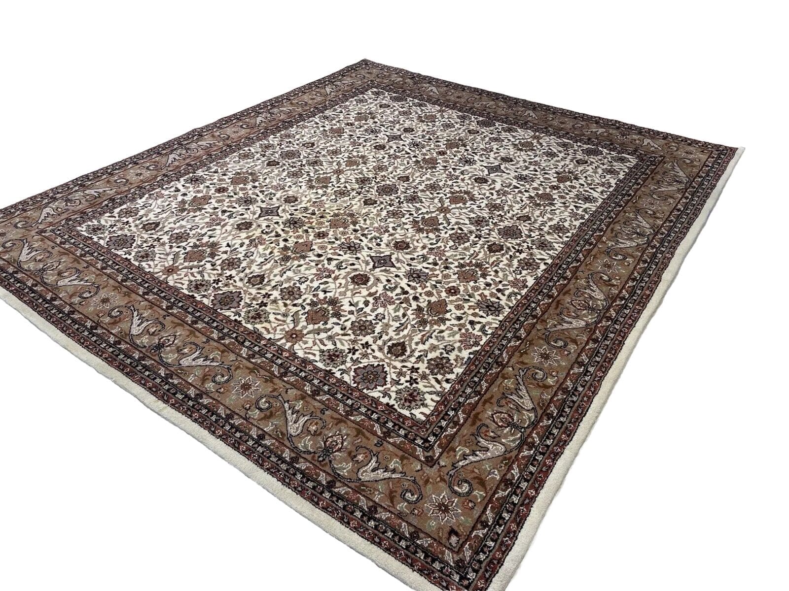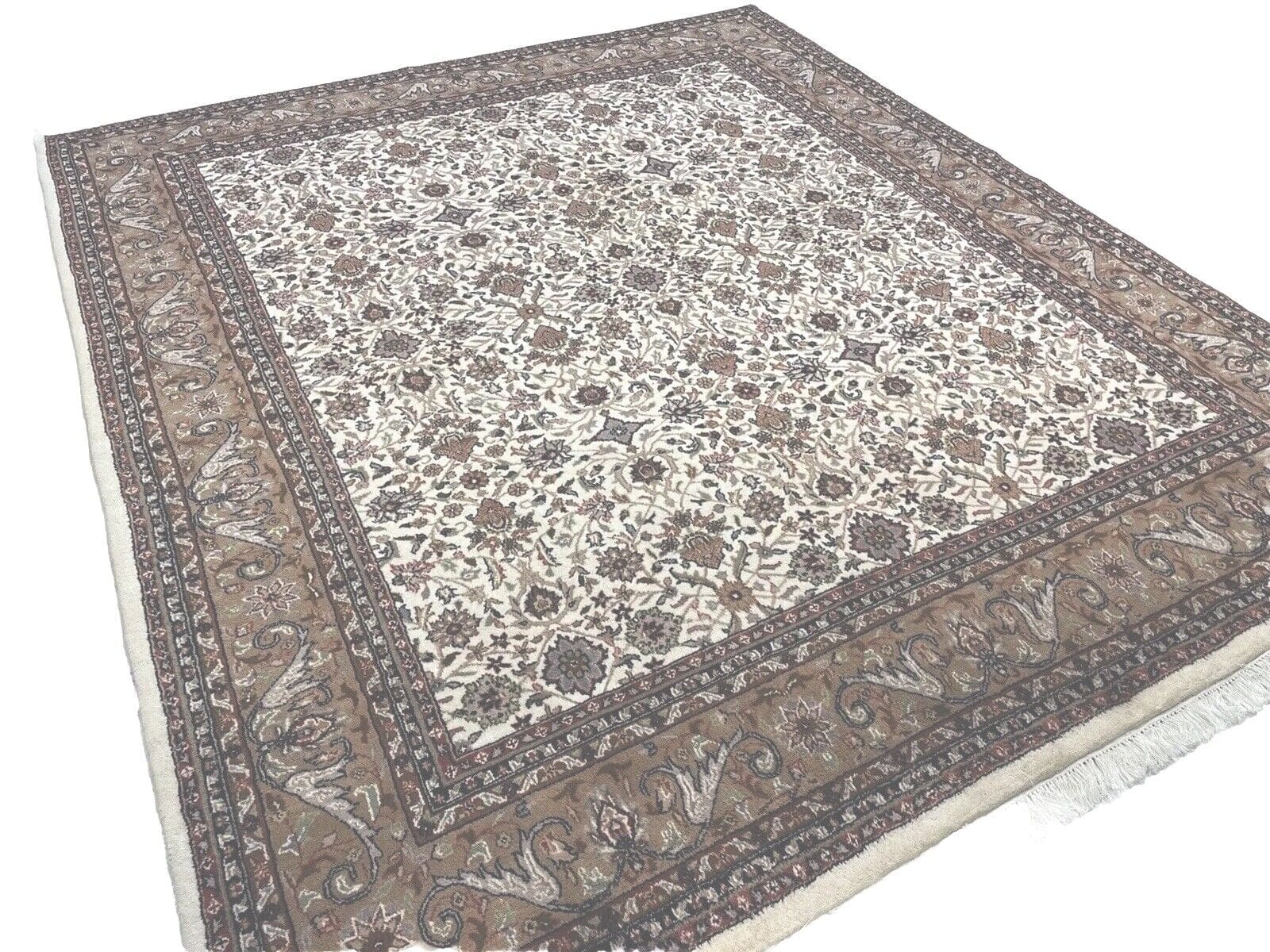 Handgeknüpfter Kaschmir Teppich | Größe: 300×250 cm | Knotendichte: Hochwertige Schurwolle | Florhöhe: 10 mm | Design: Traditionell Persisch/Orientalisch | Zustand: Neu ohne Etikett | Besonderheiten: Für Fußbodenheizung geeignet | Farbe: Beige mit rostbrauner Bordüre | Kettfaden: Baumwolle | Verwendung: Geeignet für Wohnzimmer, Schlafzimmer, Arbeitszimmer und Esszimmer