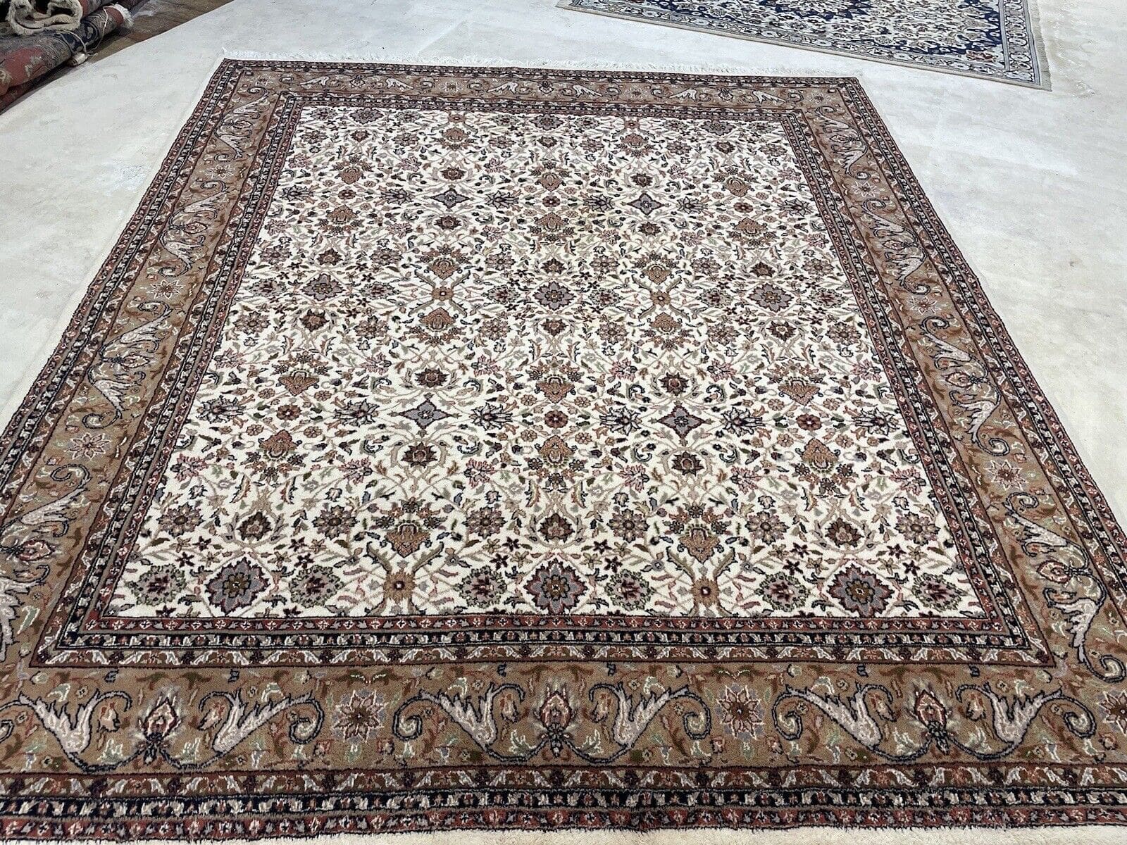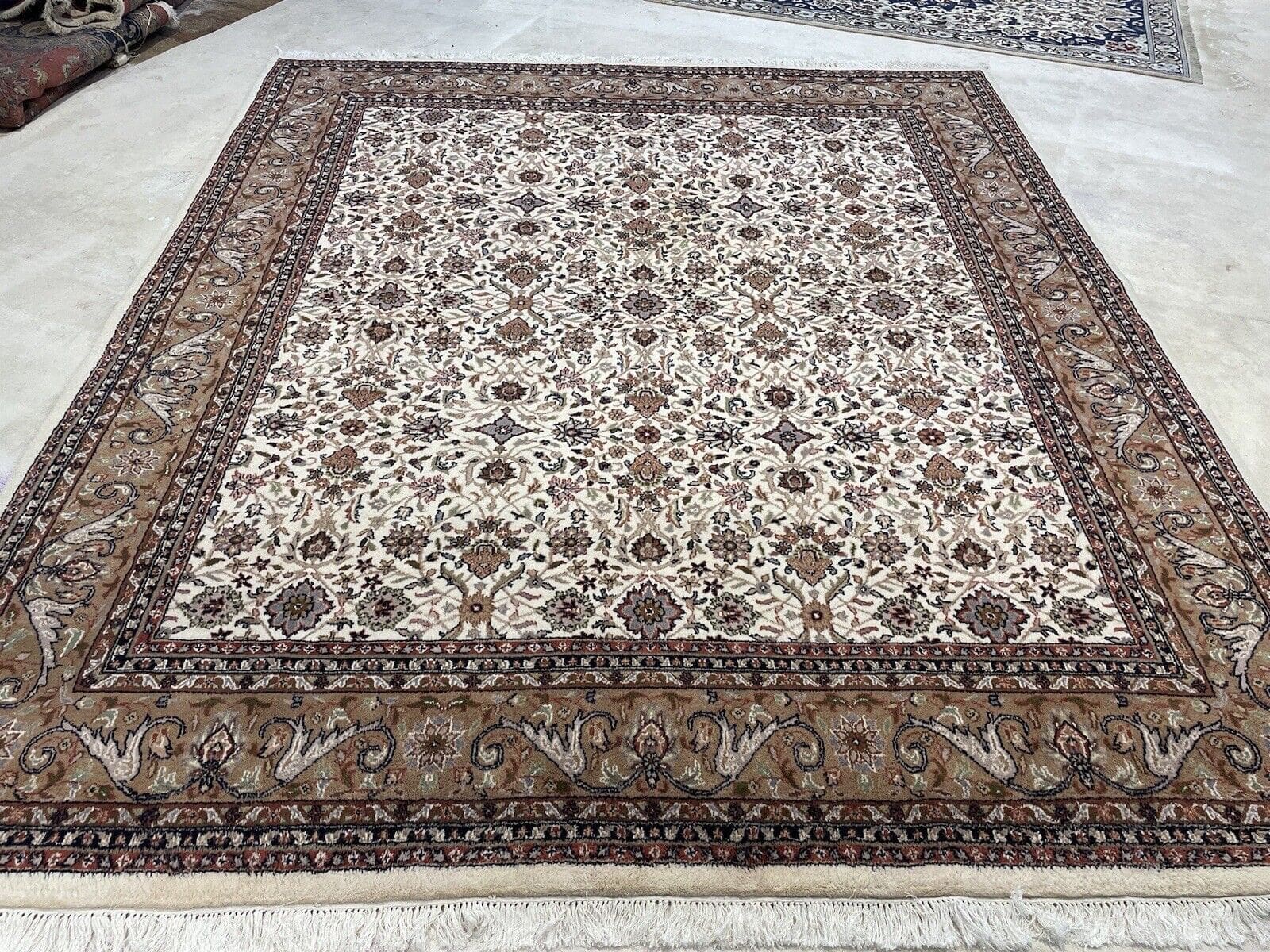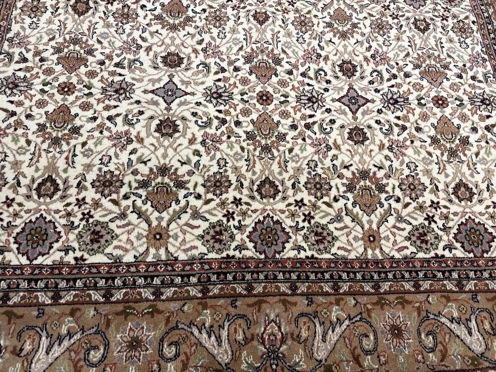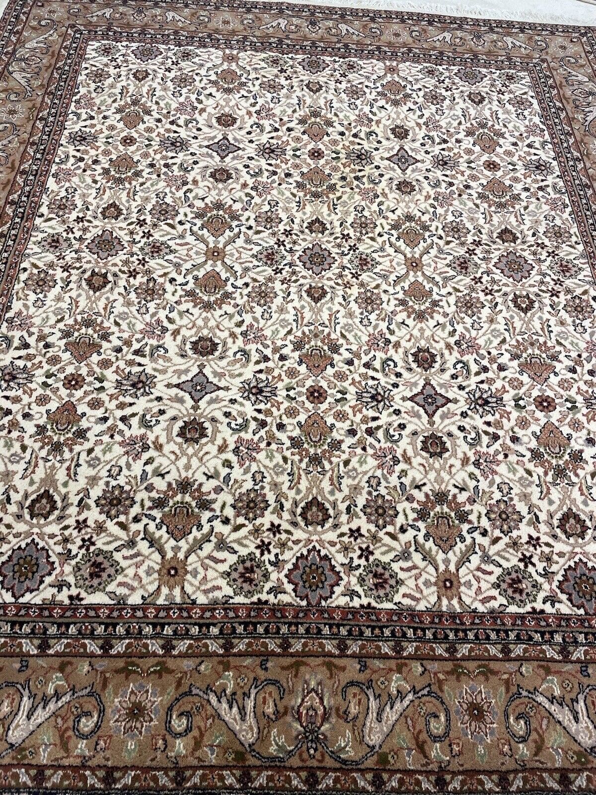 Handgeknüpfter Kaschmir Teppich | Größe: 300×250 cm | Knotendichte: Hochwertige Schurwolle | Florhöhe: 10 mm | Design: Traditionell Persisch/Orientalisch | Zustand: Neu ohne Etikett | Besonderheiten: Für Fußbodenheizung geeignet | Farbe: Beige mit rostbrauner Bordüre | Kettfaden: Baumwolle | Verwendung: Geeignet für Wohnzimmer, Schlafzimmer, Arbeitszimmer und Esszimmer