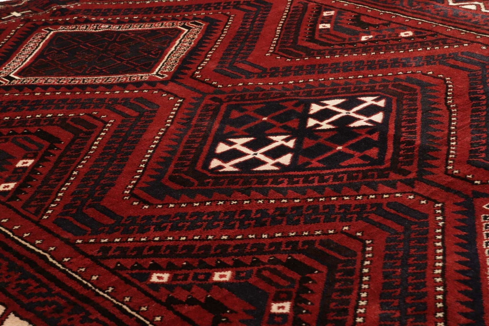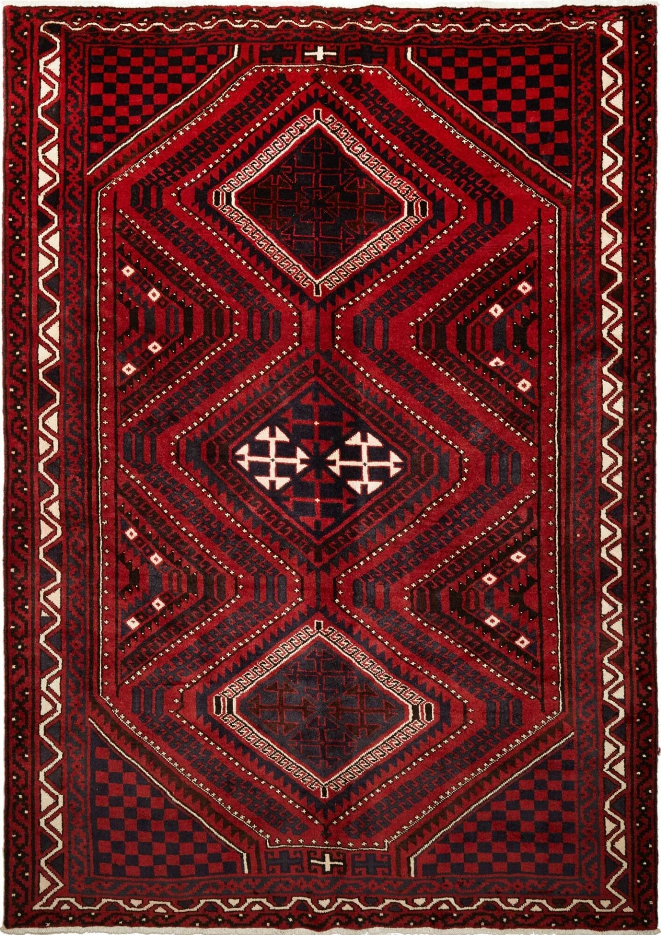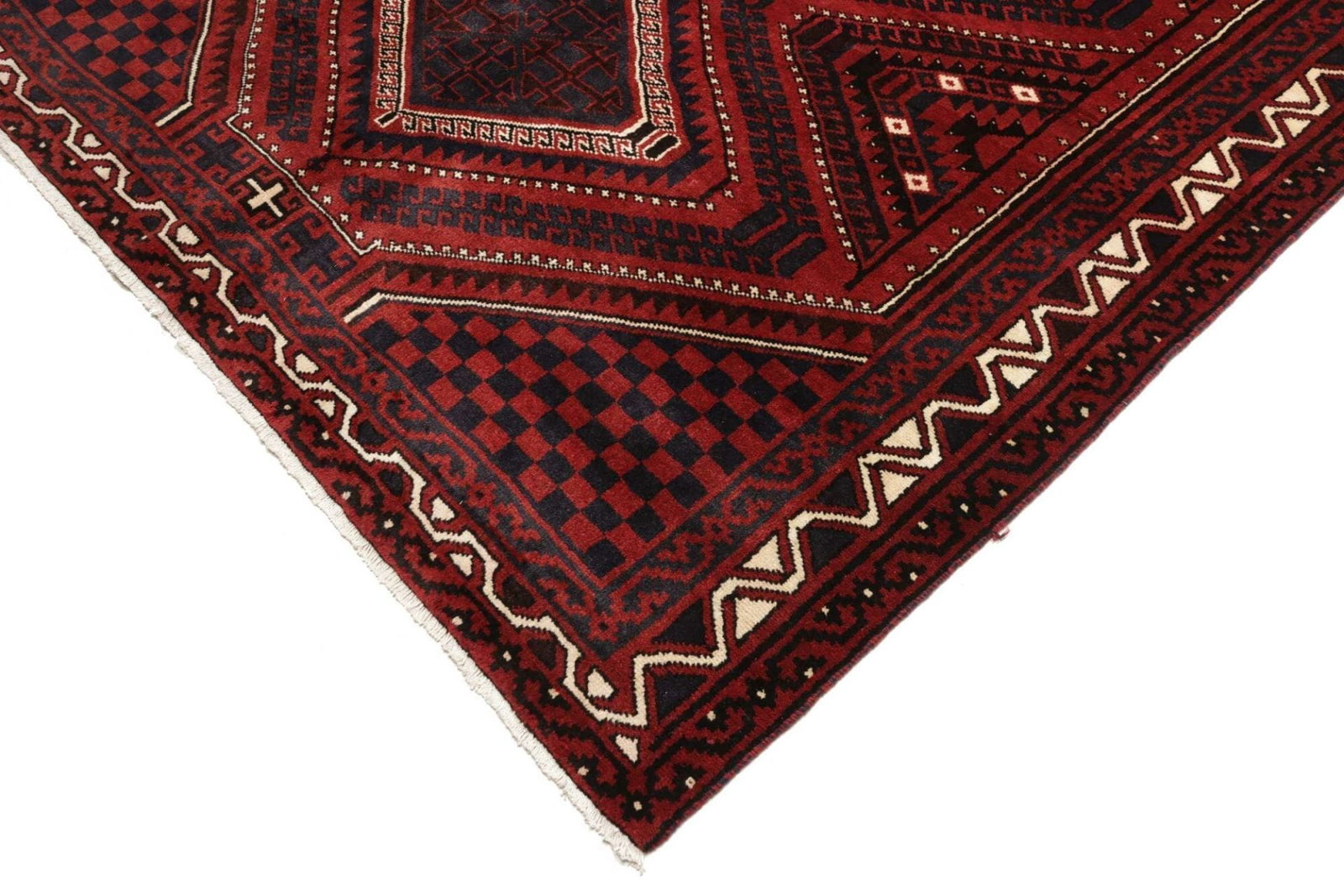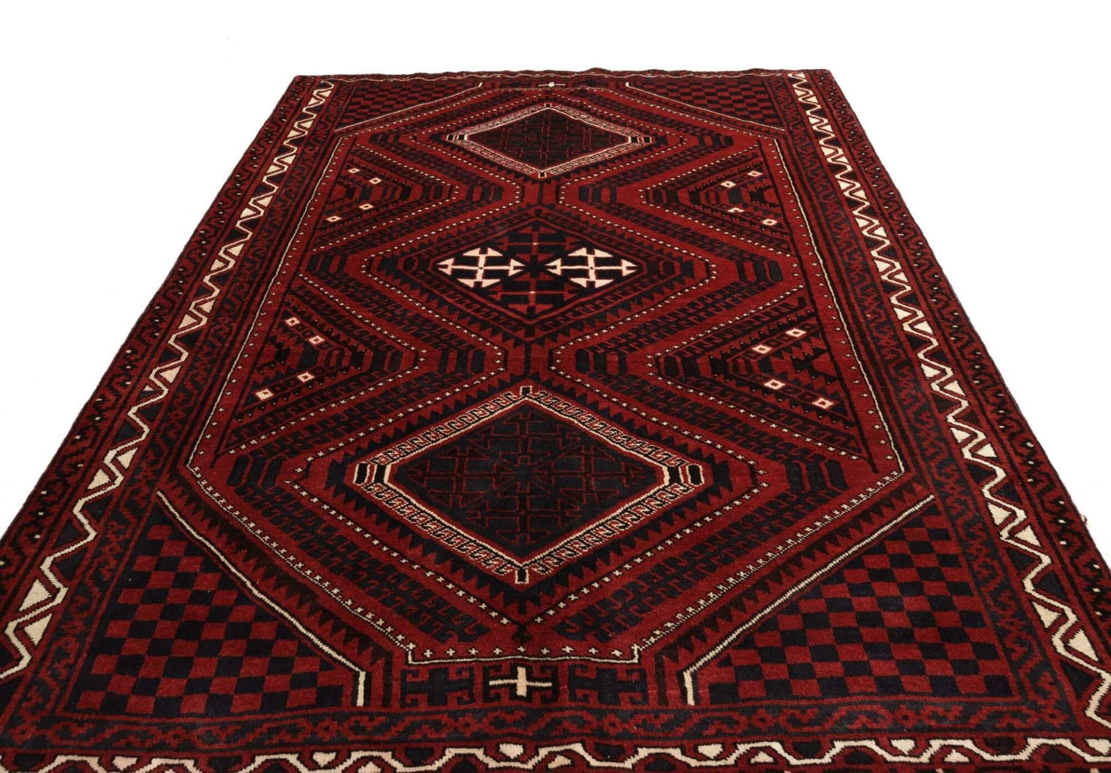 Lori Teppich | Knotendichte: ca. 200.000 Knoten/m² | Material: 100% Schurwolle | Kette: 100% Baumwolle | Größe: 223 x 307 cm | Herkunft: Iran | Zustand: Handgeknüpft und robust | Muster: Geometrisch in dunklen Blau- und Rottönen