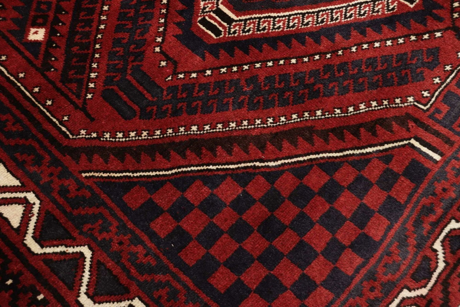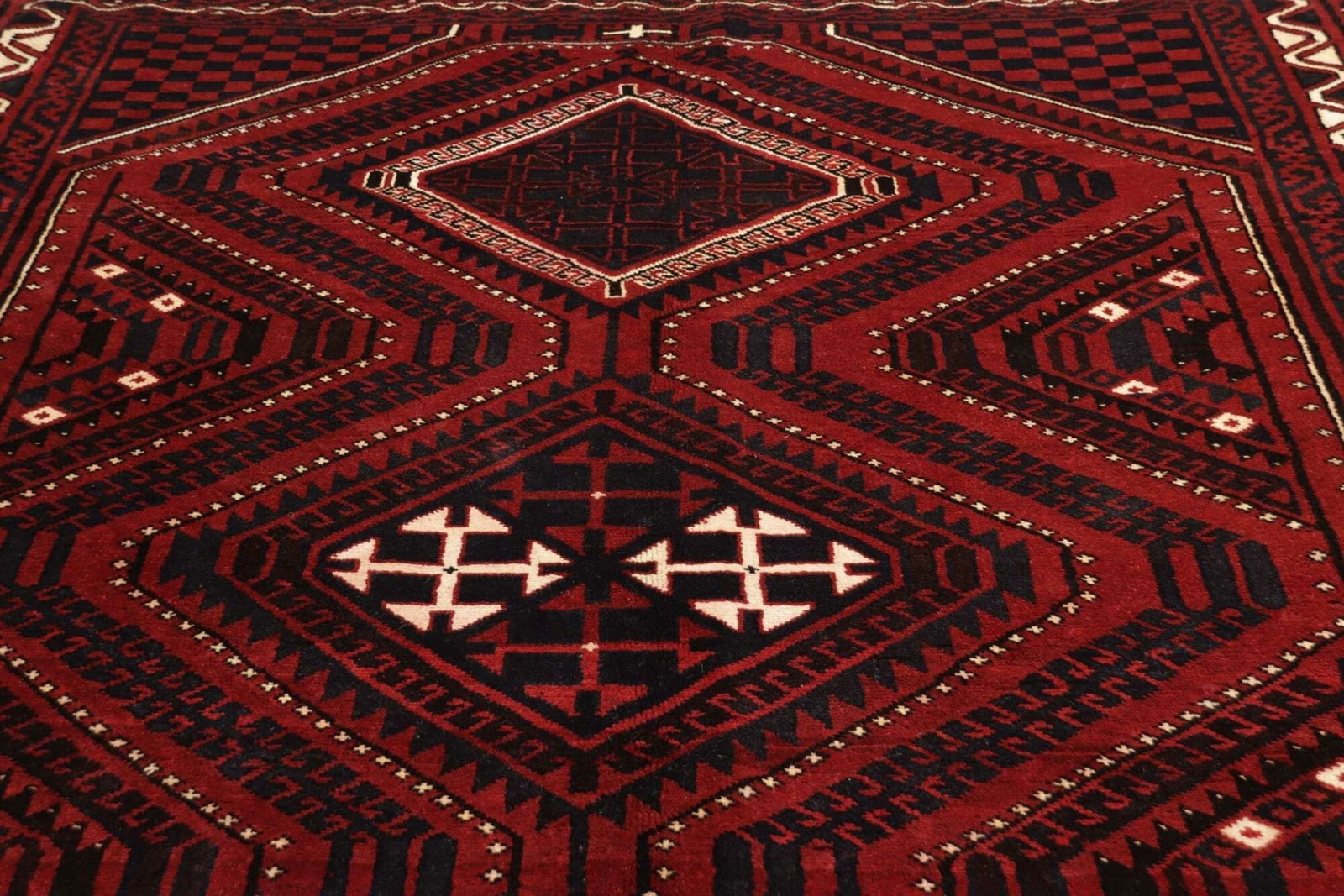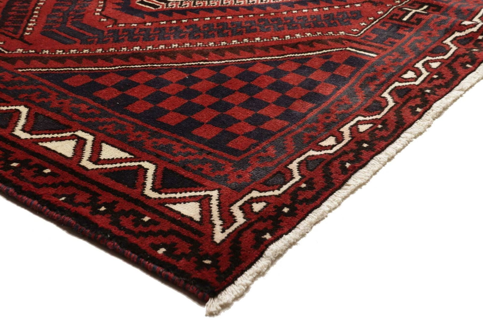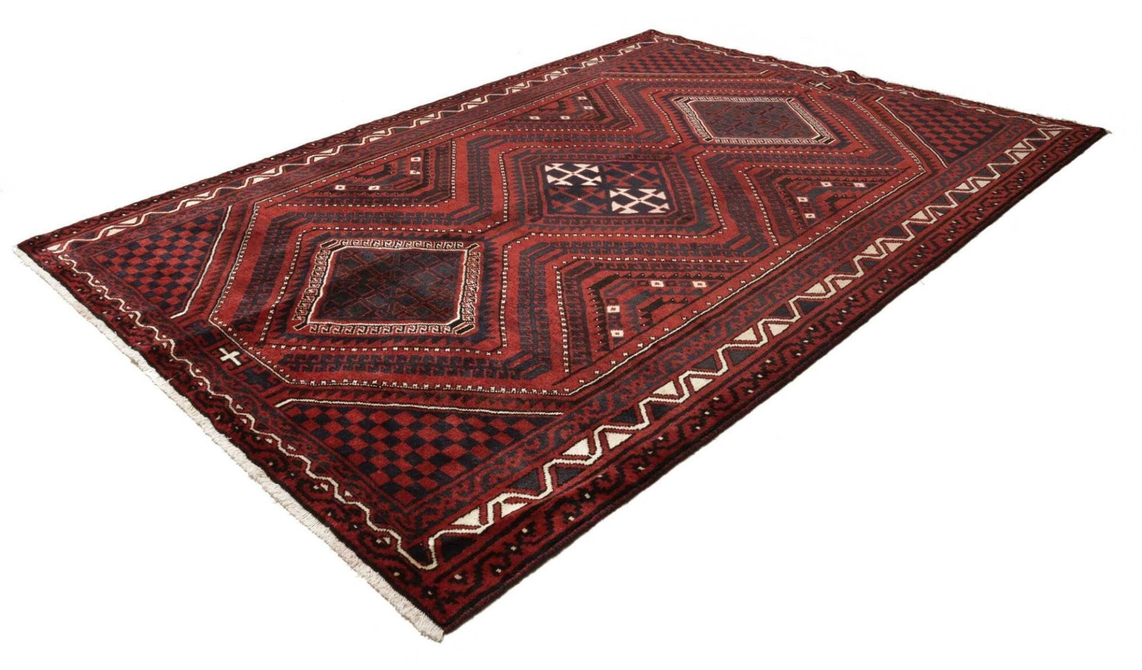 Lori Teppich | Knotendichte: ca. 200.000 Knoten/m² | Material: 100% Schurwolle | Kette: 100% Baumwolle | Größe: 223 x 307 cm | Herkunft: Iran | Zustand: Handgeknüpft und robust | Muster: Geometrisch in dunklen Blau- und Rottönen