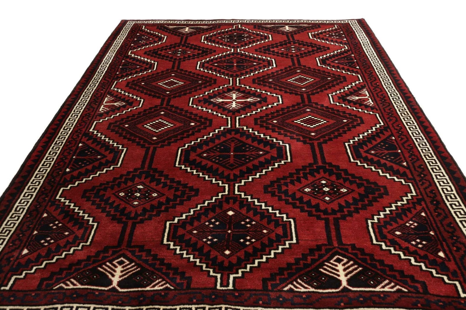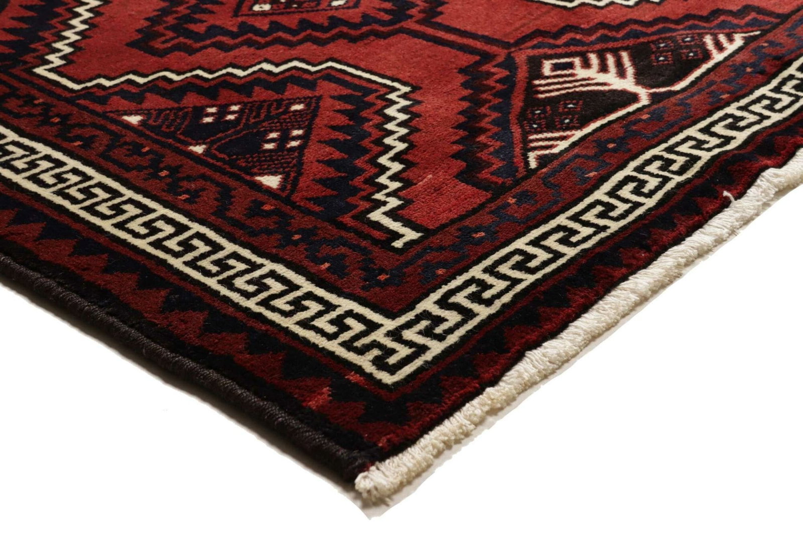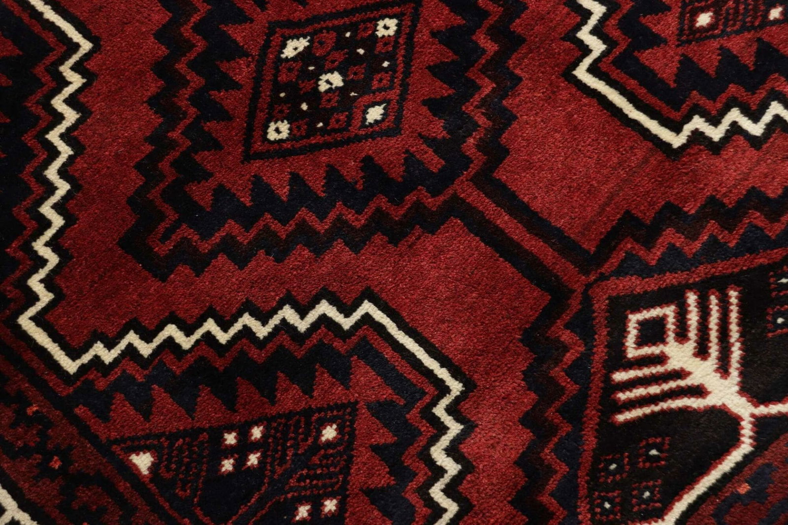 Lori Teppich | Knotendichte: ca. 200.000 Knoten/m² | Material: 100% Schurwolle | Größe: 226 x 307 cm | Herkunft: Iran | Zustand: Handgeknüpft | Muster: Geometrisch in dunklen Blau- und Rottönen | Florhöhe: ca. 10-12 mm