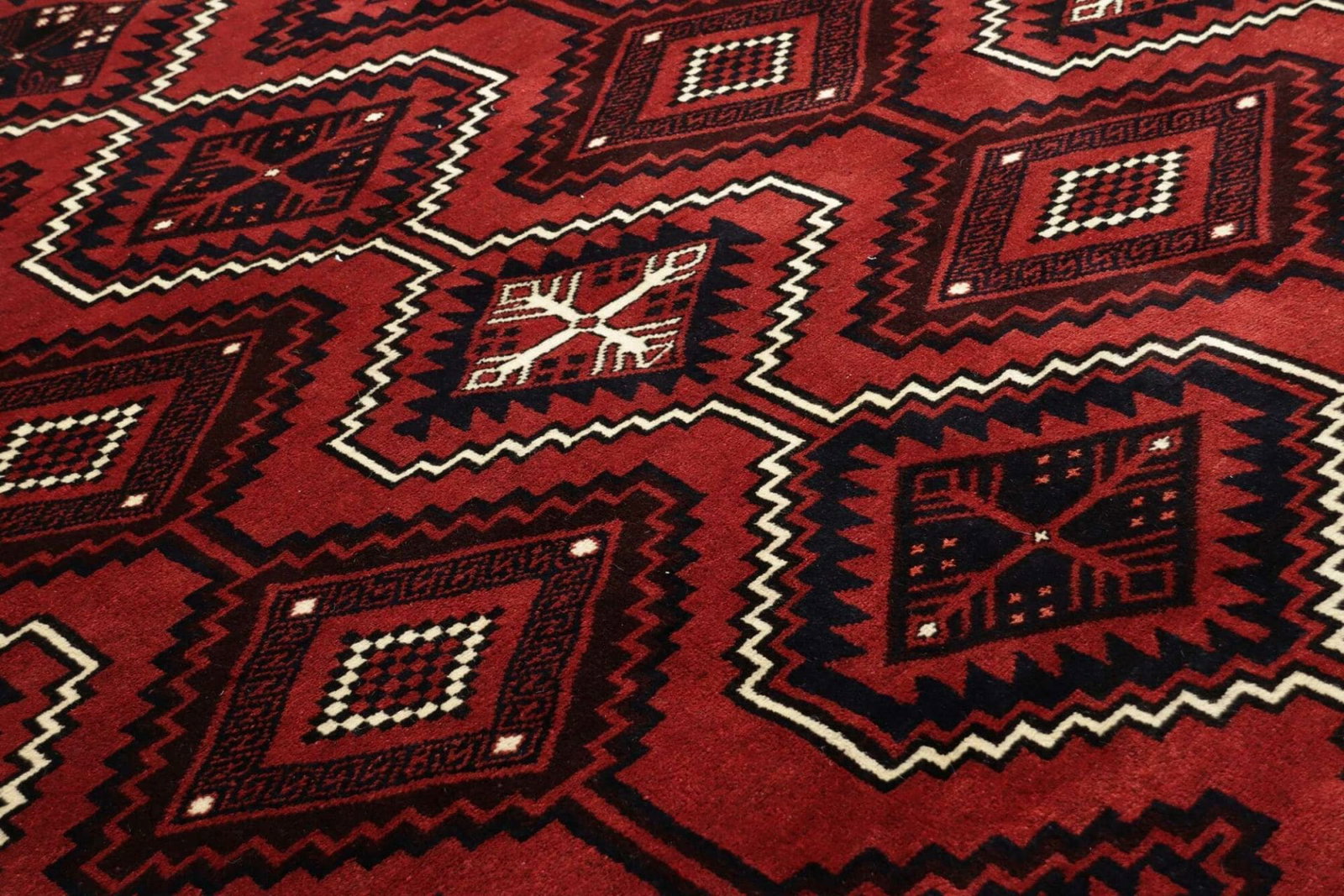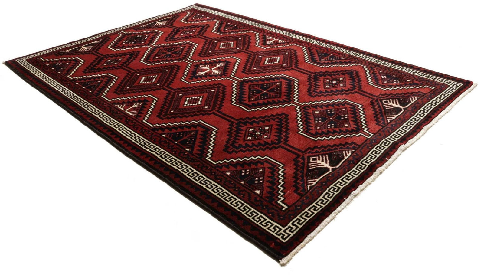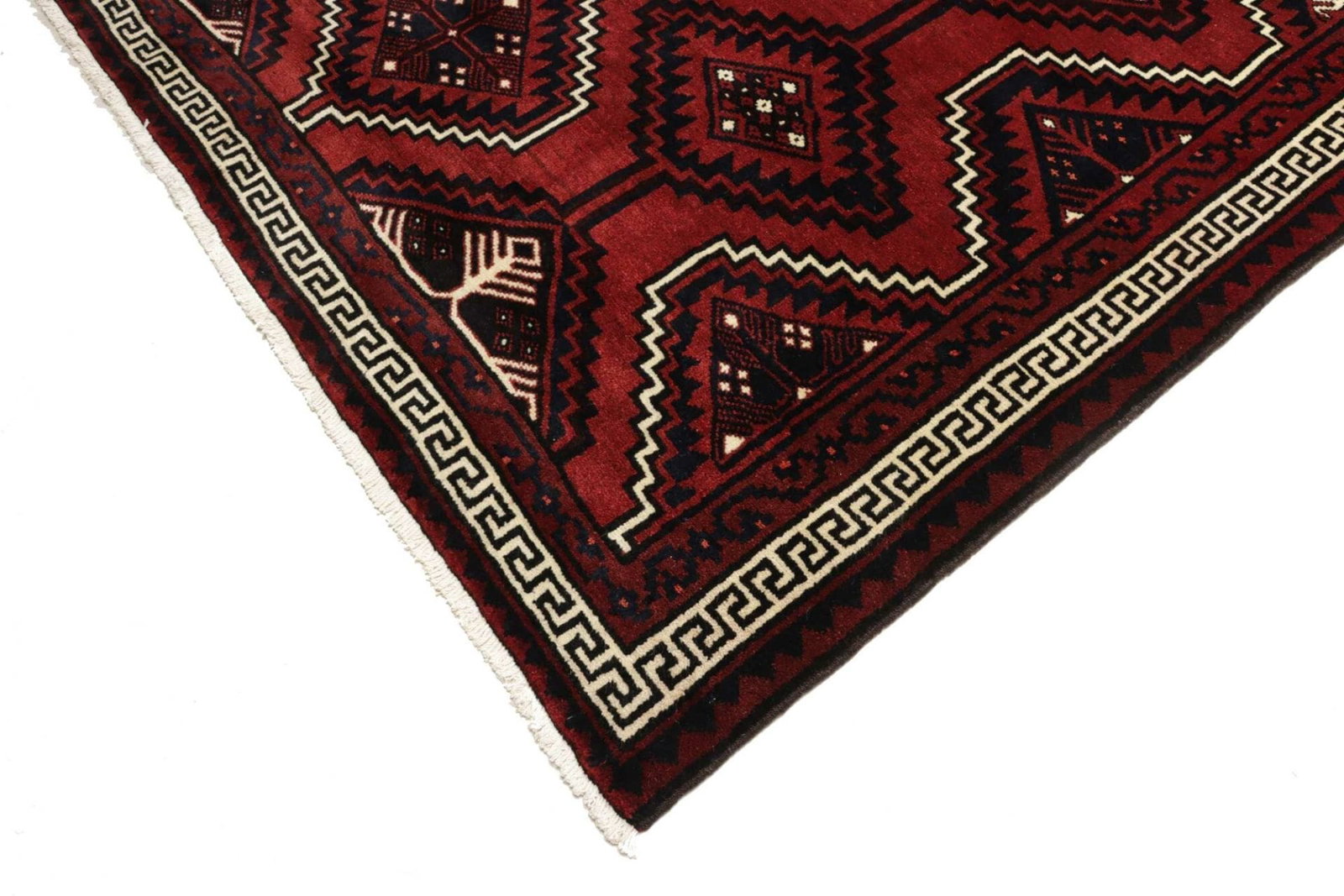 Lori Teppich | Knotendichte: ca. 200.000 Knoten/m² | Material: 100% Schurwolle | Größe: 226 x 307 cm | Herkunft: Iran | Zustand: Handgeknüpft | Muster: Geometrisch in dunklen Blau- und Rottönen | Florhöhe: ca. 10-12 mm