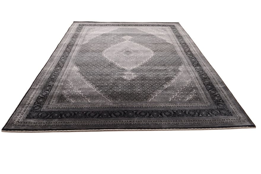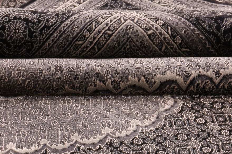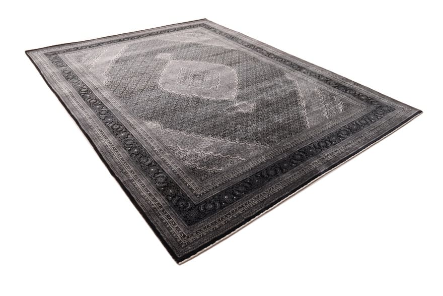 Loribaft Teppich | Knotendichte: 160.000 – 200.000 Knoten/m² | Material: Wolle mit Bamboo Seide | Größe: 364×276 cm | Zustand: Neu | Ursprung: Indien | Verarbeitung: Handgeknüpft | Farbe: Schwarz/Grau | Dicke: ca. 10 mm | Gewicht: ca. 35 kg