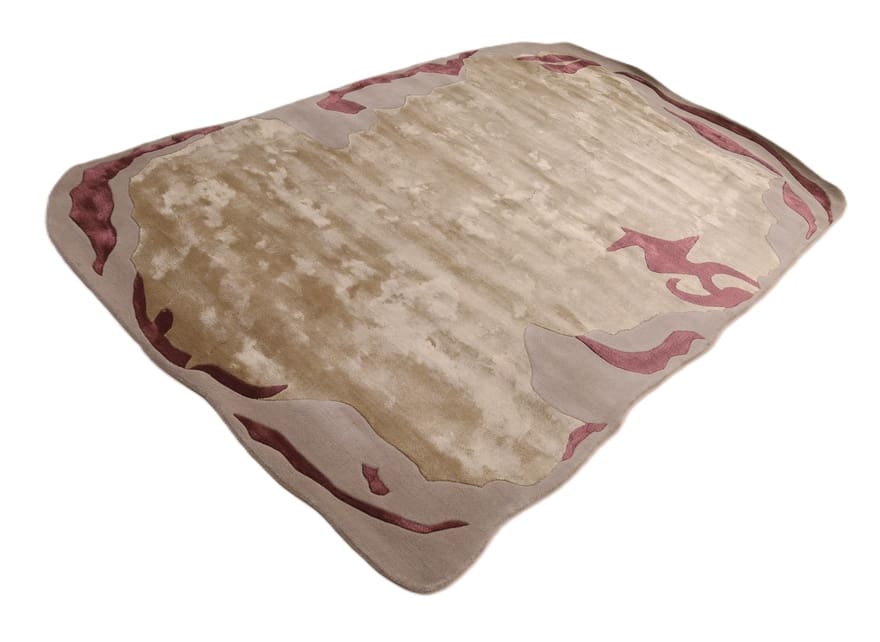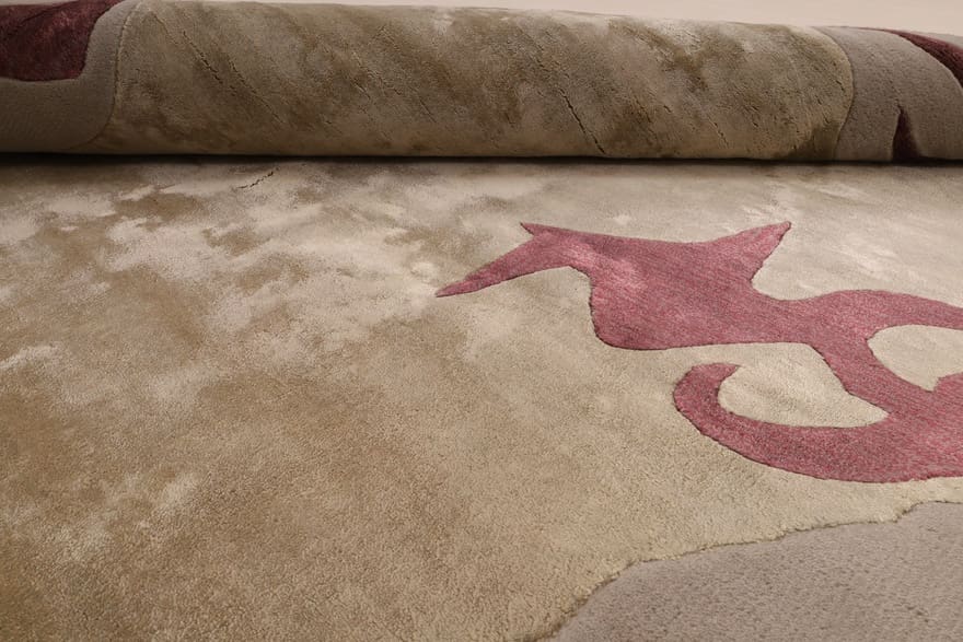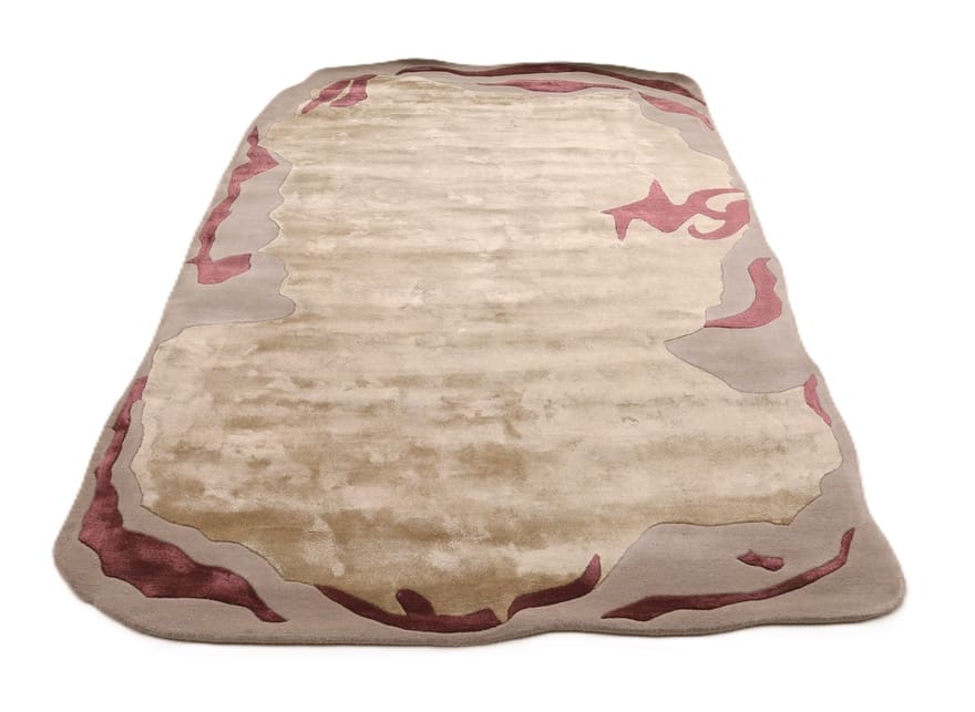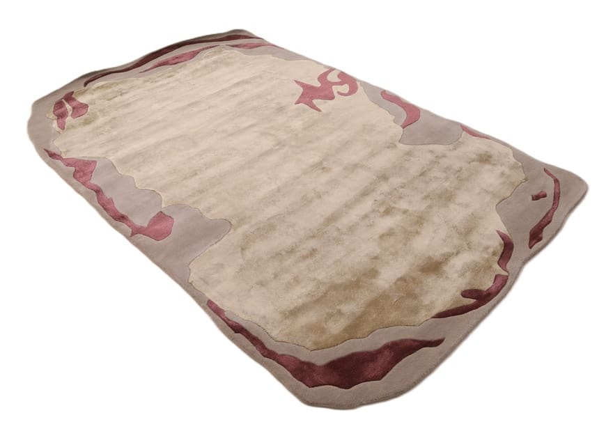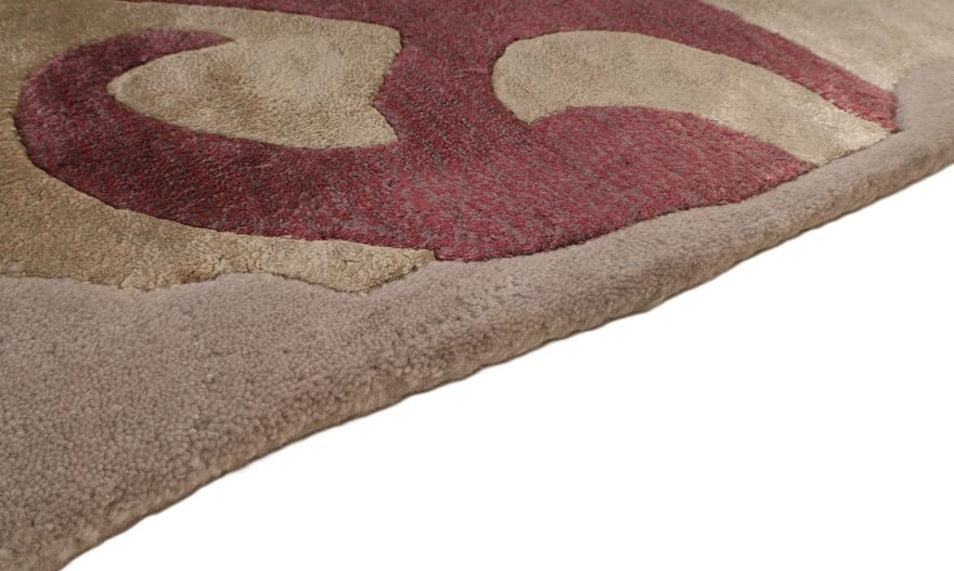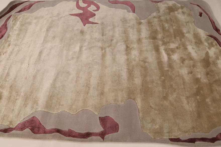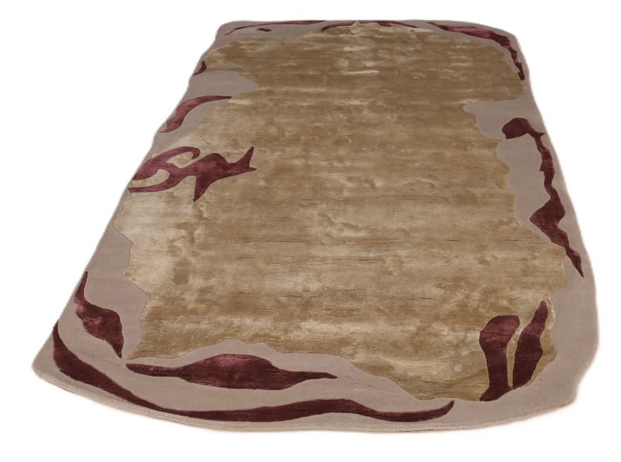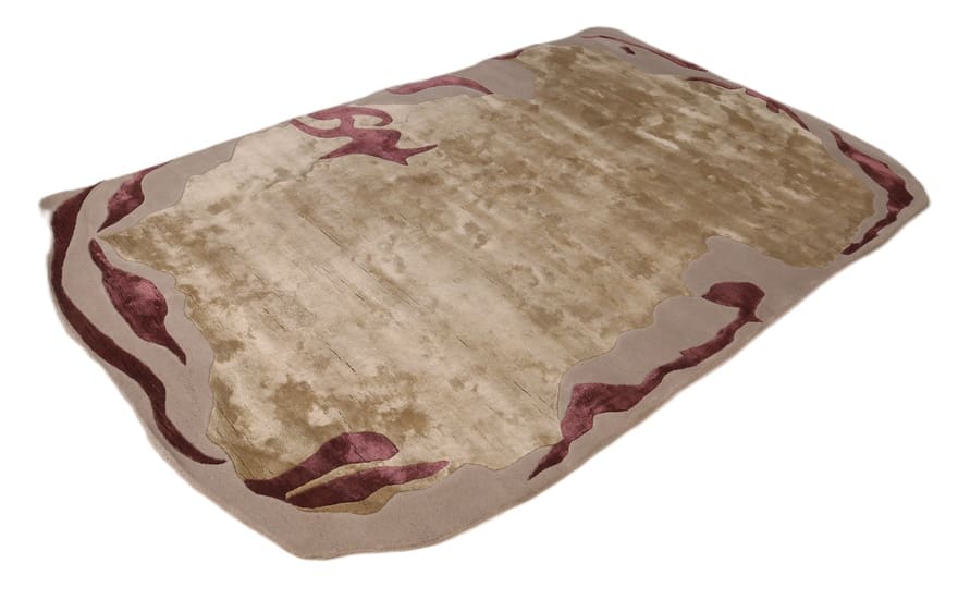 Luxuriöser handgetufteter Teppich | Knotendichte: 200.000 – 250.000 Knoten/m² | Material: Wolle und Bambusseide | Größe: 247×151 cm | Farbe: Gold, Beige und Bordeauxrot | Herkunft: Indien | Zustand: Neu | Dicke: ca. 14 mm | Pflegeleicht und langlebig