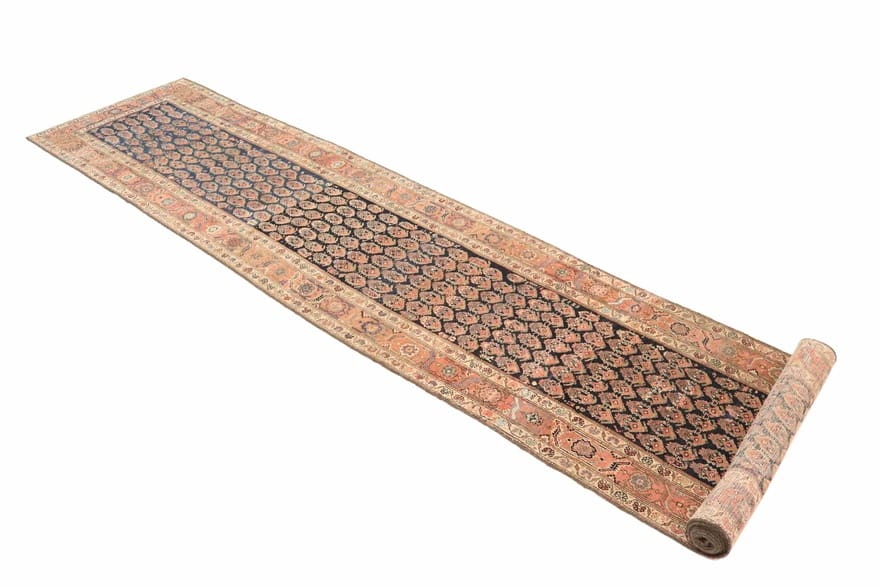 Antiker Malayer Teppich | Knotendichte: 200.000 – 250.000 Knoten/m² | Material: Handgeknüpfte Wolle | Größe: 592×91 cm | Farbe: Blau/Türkis | Zustand: Antik | Ursprung: Iran / Persien