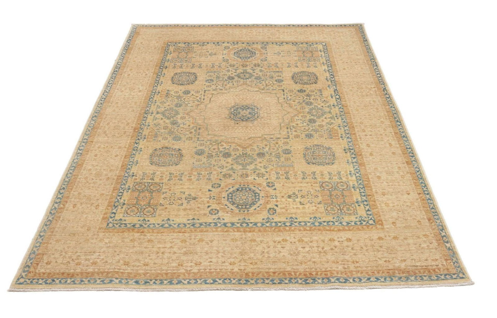Handgeknüpfter Mamluk-Teppich | Knotendichte: ca. 300.000 Knoten/m² | Material: 100% Schurwolle (Flor) und 100% Baumwolle (Kette) | Größe: 148 x 196 cm | Höhe: ca. 5-7 mm | Herkunft: Pakistan | Ursprünglich aus dem Ägyptischen Reich, typisches Mamluk-Medaillon in der Mitte | Sehr gute Verarbeitung und hohe Qualität