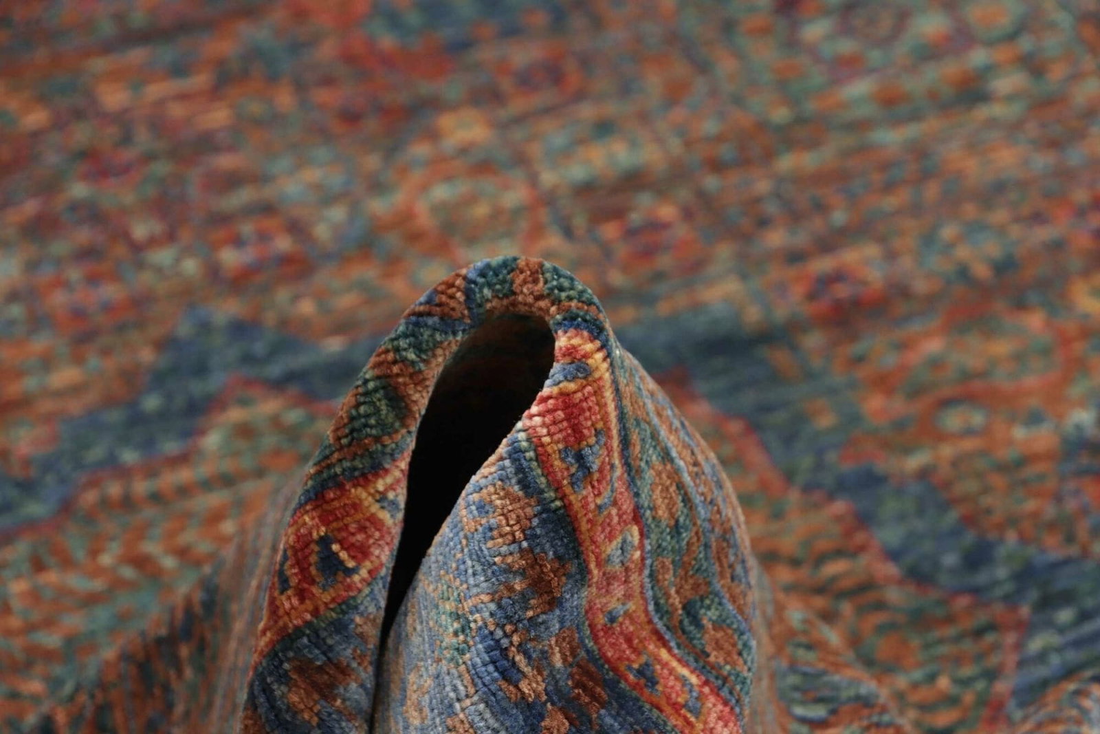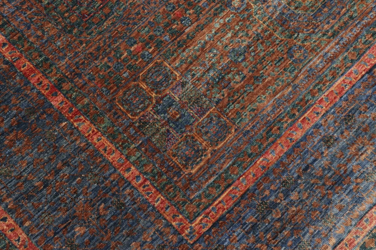 Dieser Teppich ist aus hochwertiger Schurwolle gefertigt, die nicht nur für ihre Weichheit und Langlebigkeit bekannt ist, sondern auch für ihre hervorragenden Gebrauchseigenschaften. Schurwolle verfügt über natürliche isolierende Eigenschaften, die den Teppich sowohl warm als auch angenehm auf der Haut machen. Durch die handgeknüpfte Technik wird jeder einzelne Knoten präzise und sorgfältig gesetzt, was zu einer hohen Knotendichte führt. Dies macht den Teppich nicht nur robust, sondern trägt auch zur Erhaltung seiner Formen und Farben über viele Jahre bei.