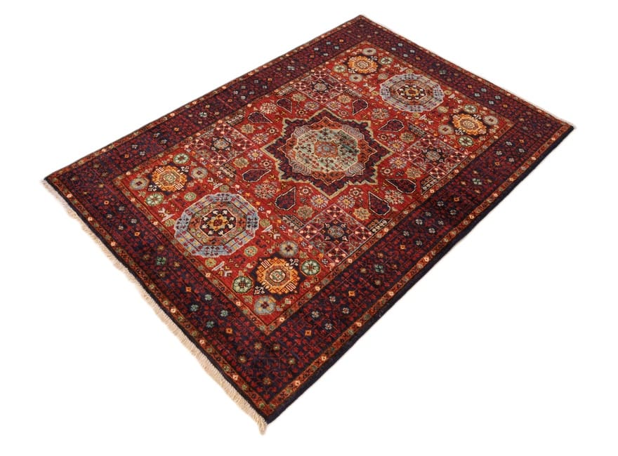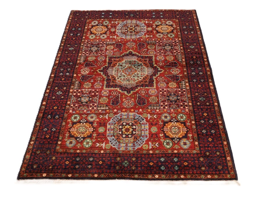Mamluk-Teppich | Knotendichte: 160.000-200.000 Knoten/m² | Material: Handgesponnene Wolle | Größe: 150×106 cm | Herkunft: Pakistan | Zustand: Neu | Design: Traditionelle Mamluk-Muster | Eigenschaften: Schmutzabweisend, wärmeisolierend, weich, langlebig