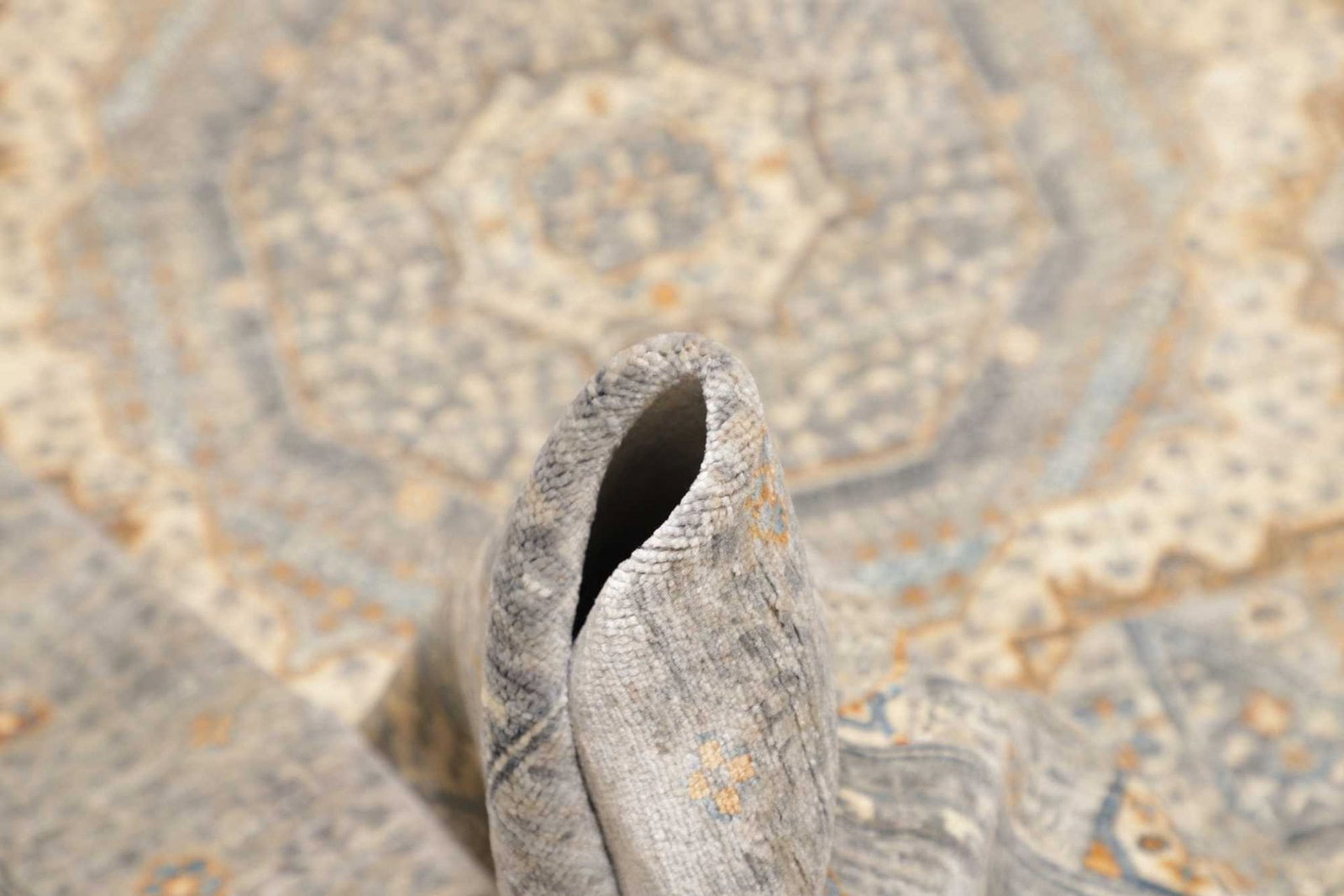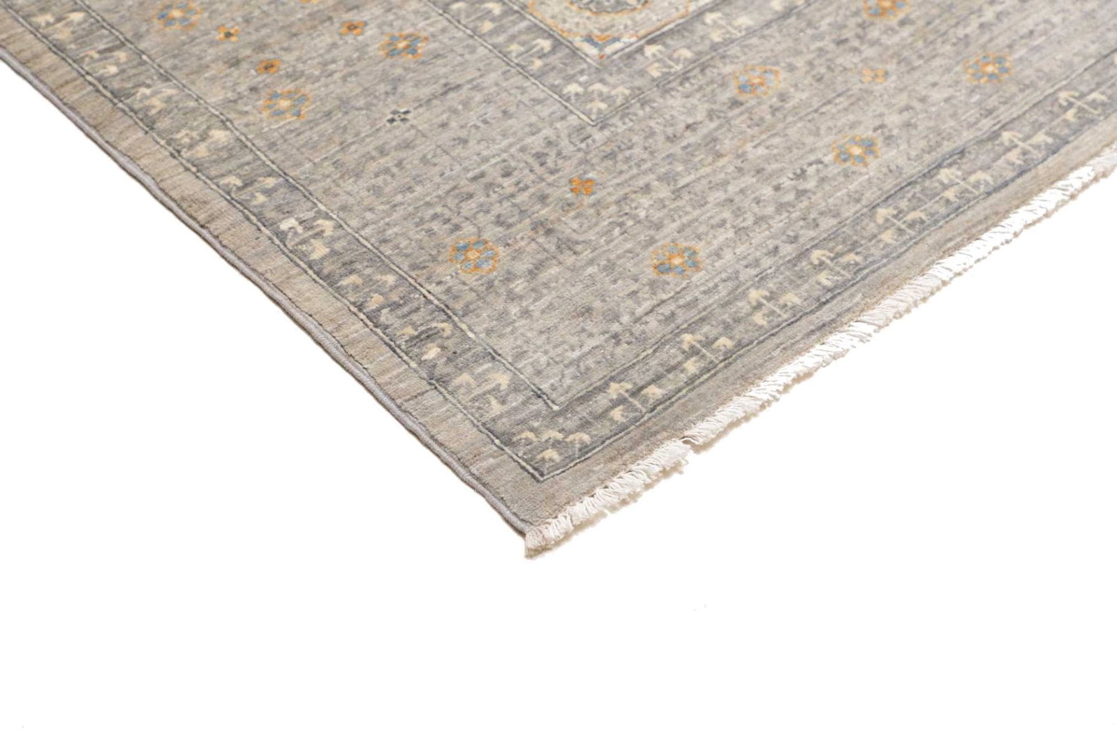 Der Teppich ist aus reiner Schurwolle gefertigt, die für ihre Strapazierfähigkeit und ihren Komfort geschätzt wird. Schurwolle ist bekannt für ihre Fähigkeit, Wärme zu speichern und dennoch atmungsaktiv zu sein, wodurch sie sich sowohl für kühle als auch warme Klimazonen eignet. Die handgeknüpfte Technik, die bei der Herstellung des Teppichs verwendet wird, verleiht ihm eine hohe Knotendichte, die sowohl die Langlebigkeit als auch die Detailtreue des Musters garantiert. Jeder Knoten erzählt eine Geschichte und ist das Ergebnis jahrelanger Erfahrung und Tradition von Handwerkern, die ihr Wissen über Generationen hinweg weitergegeben haben.