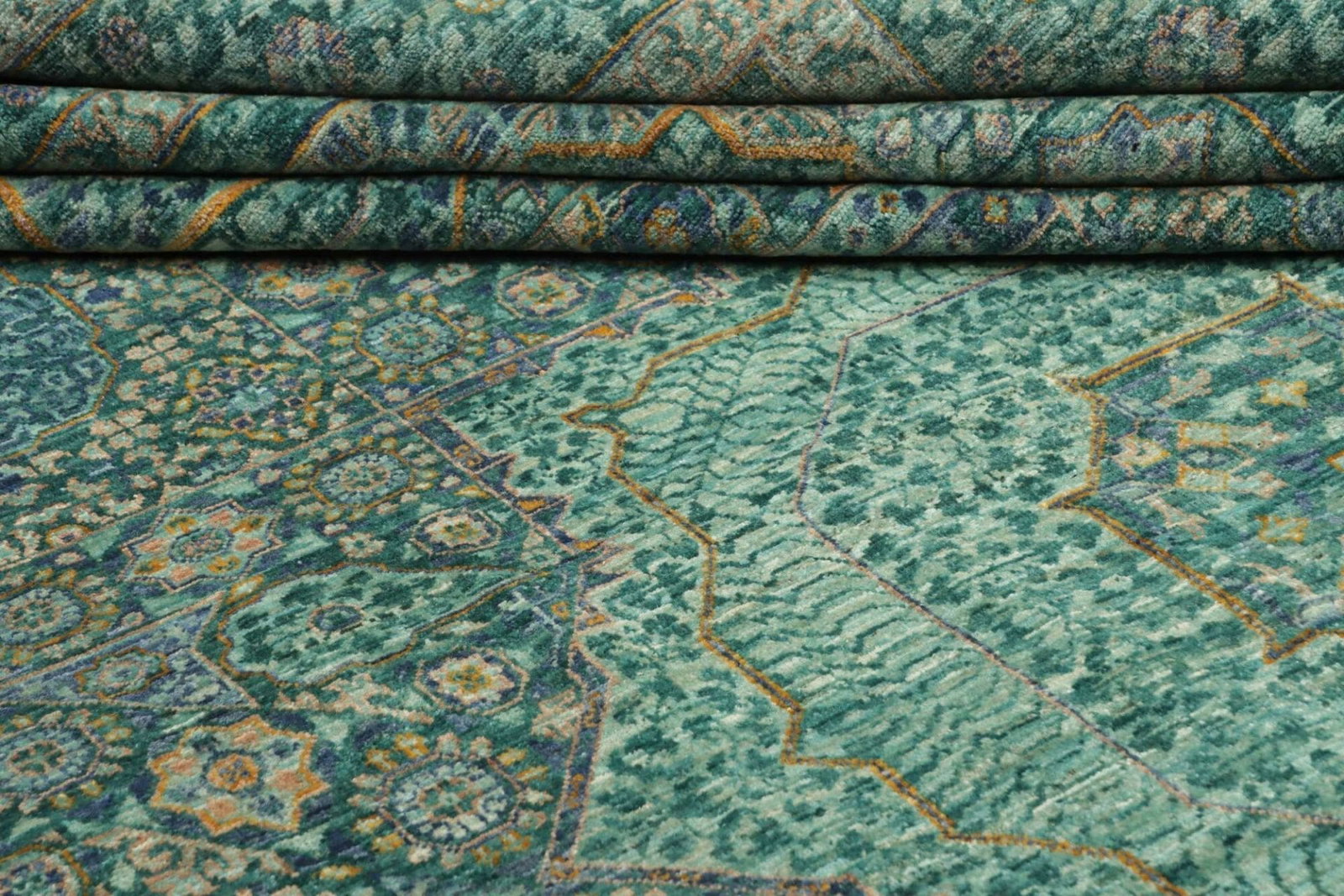 Ein herausragendes Merkmal dieses Teppichs sind die komplexen Muster und die lebendige Farbpalette, die typisch für Mamluk-Teppiche sind. Die Muster bestehen häufig aus geometrischen Formen, Mandalas und stilisierten floralen Motiven, die durch intensive Farben wie Rot, Blau, Gold und Beige zum Leben erweckt werden. Diese Designs sind nicht nur dekorativ, sondern tragen oft auch symbolische Bedeutungen, die tief in der Geschichte und den Traditionen der Region verwurzelt sind.