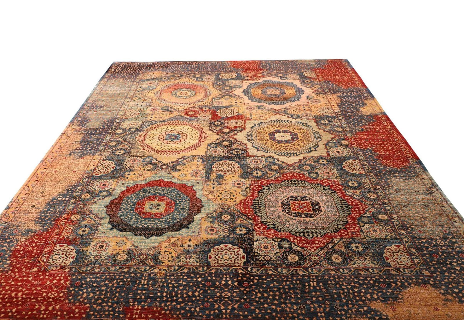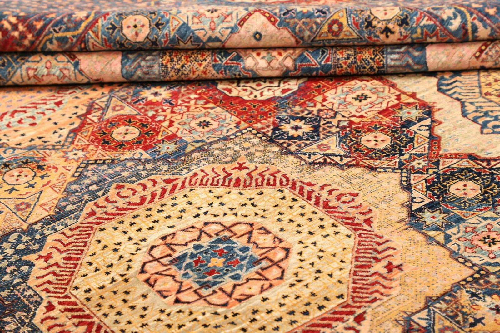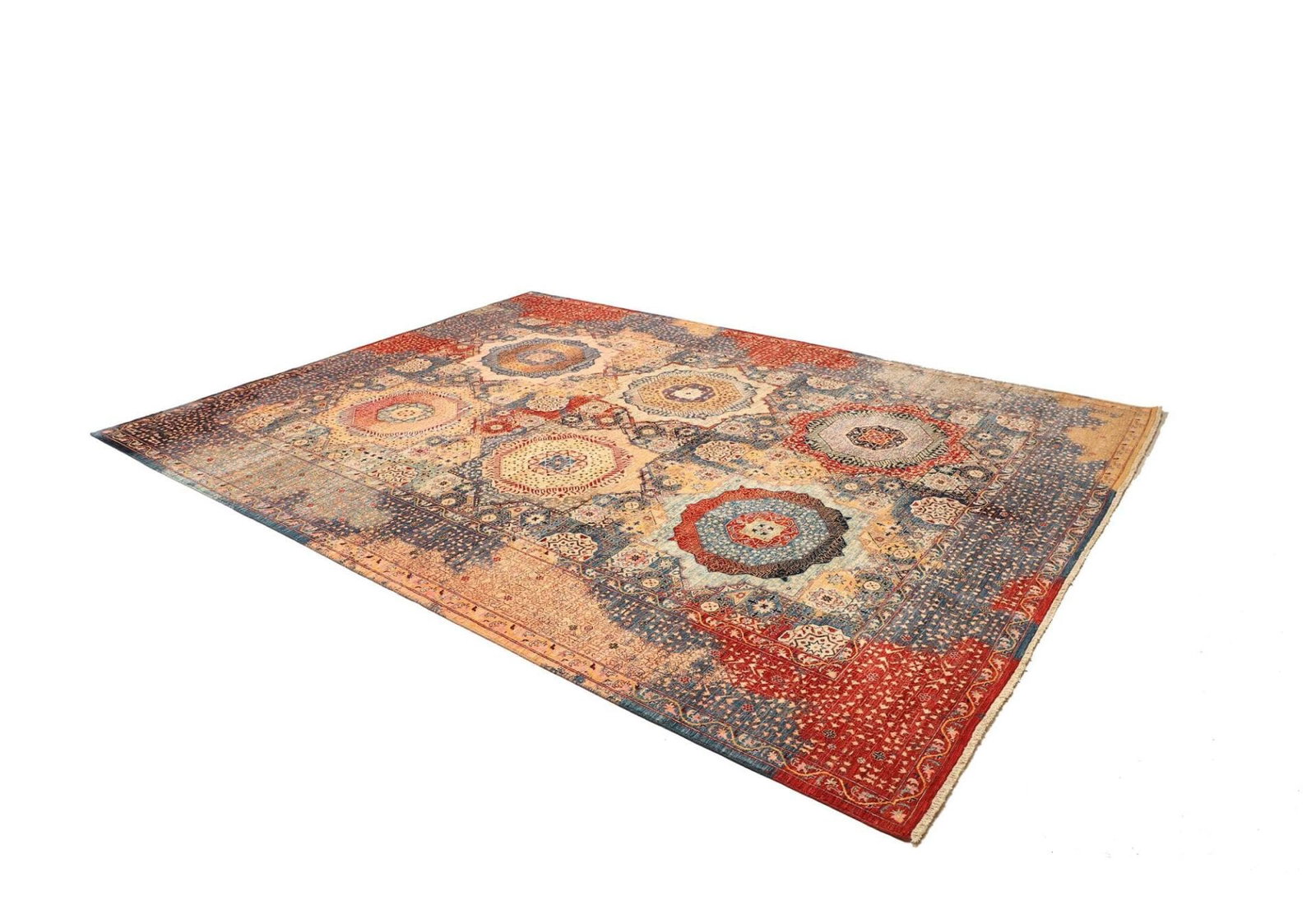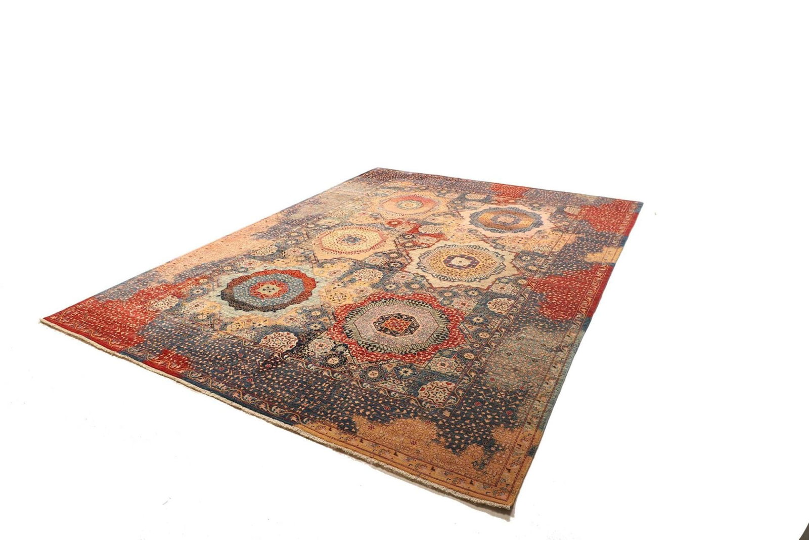 Mit einer Knotendichte, die die Qualität und Kunstfertigkeit des Handwerks unterstreicht, zeugt dieser Teppich von exzellenter Verarbeitung und Liebe zum Detail. Er wurde unter der Verwendung traditioneller Techniken gefertigt, die über Generationen hinweg weitergegeben wurden und noch immer in spezialisierten Werkstätten zum Einsatz kommen. Mamluk-Teppiche sind bekannt für ihre geometrischen Muster und reichen Farben, die von den kulturellen Einflüssen und der künstlerischen Freiheit der Mamluk-Dynastie geprägt sind.