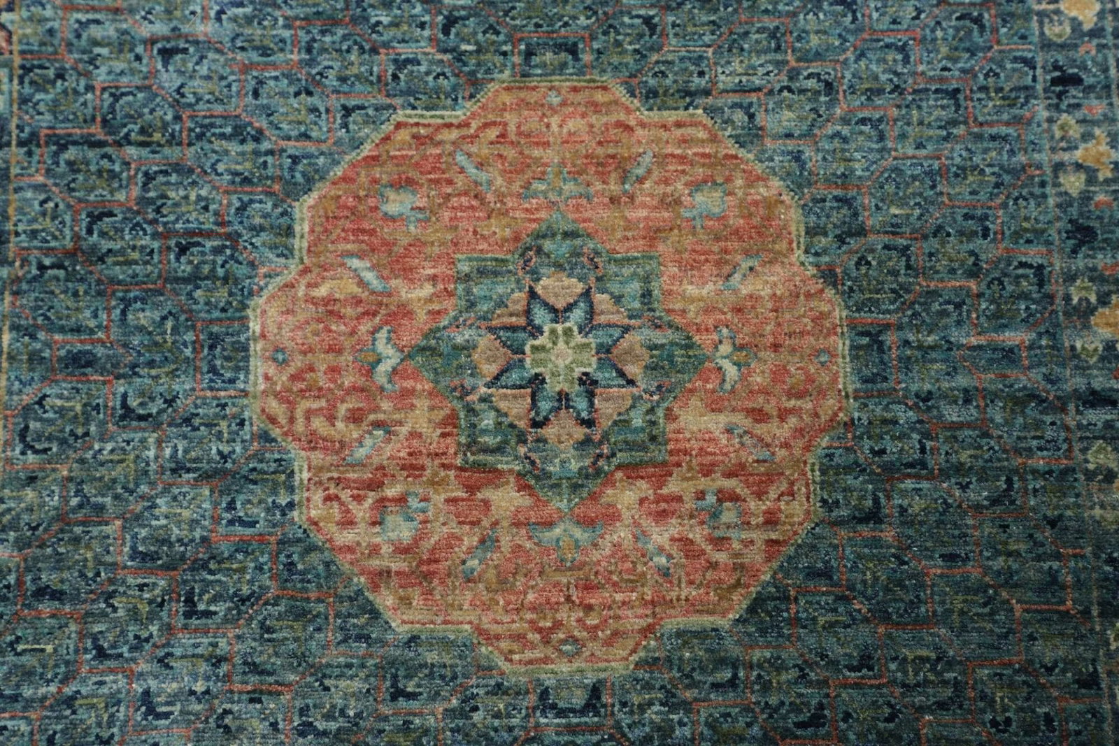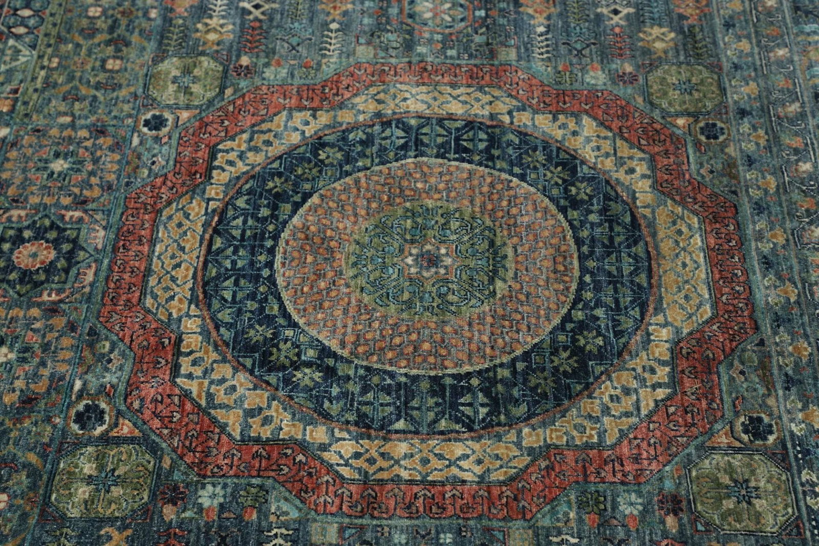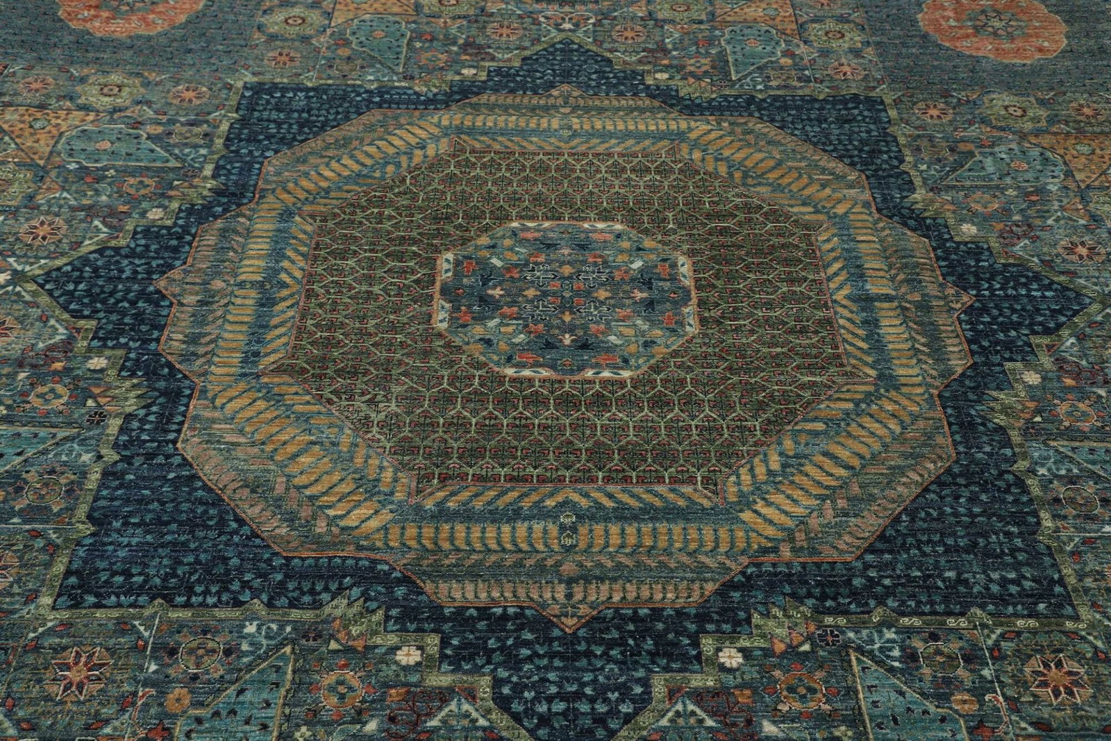 Mamluk Teppich | Knotendichte: ca. 300.000 Knoten/m² | Material: 100% Schurwolle | Größe: 391 x 594 cm | Zustand: Handgeknüpft | Herkunft: Pakistan | Besonderheit: Mamluk-Medaillon in der Mitte