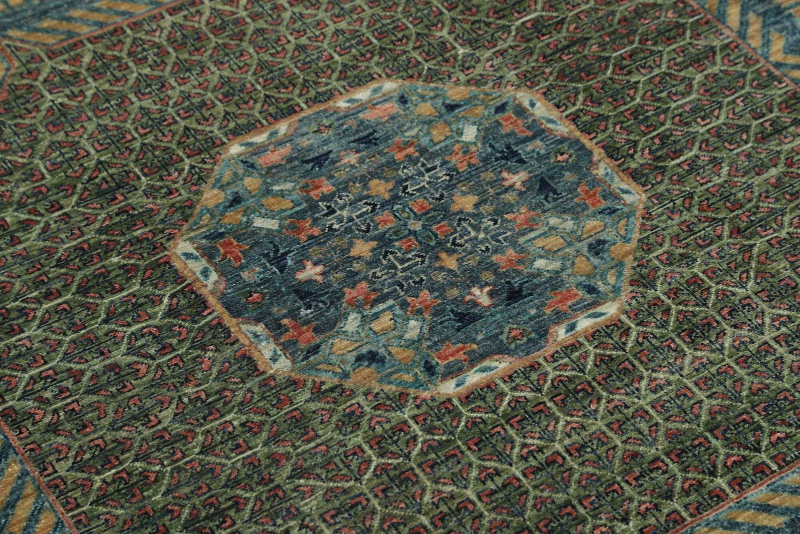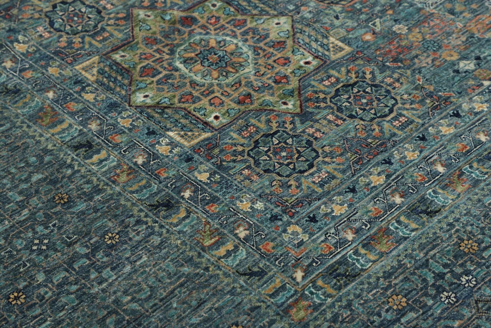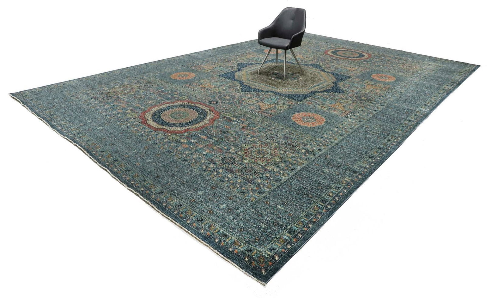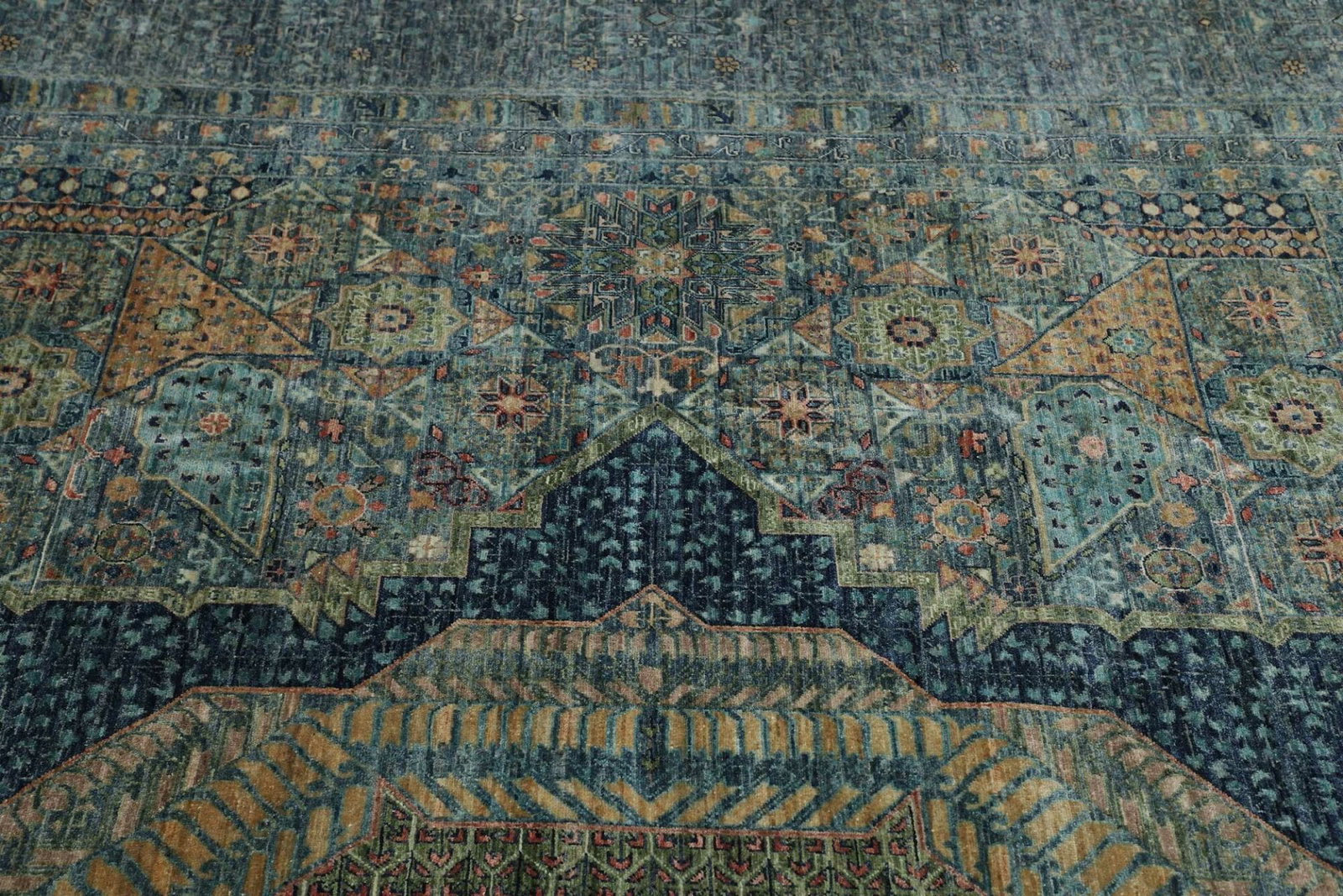 Mamluk Teppich | Knotendichte: ca. 300.000 Knoten/m² | Material: 100% Schurwolle | Größe: 391 x 594 cm | Zustand: Handgeknüpft | Herkunft: Pakistan | Besonderheit: Mamluk-Medaillon in der Mitte