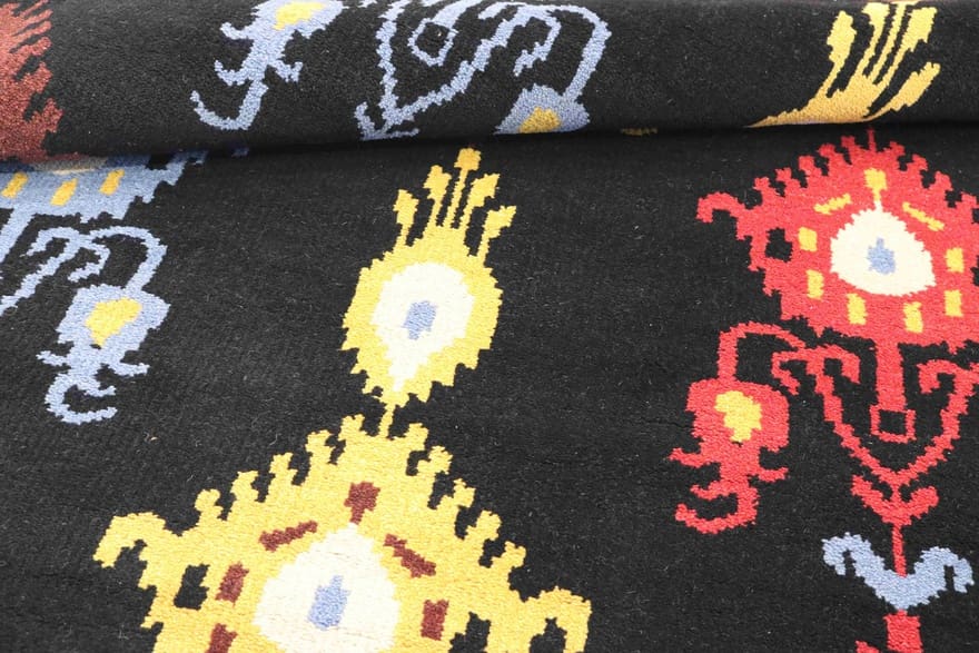 | Moderner Ikat-Teppich | Knotendichte: 90.000 Knoten/m² | Material: Wolle (Flor), Baumwolle (Kette) | Größe: 240×173 cm | Zustand: Neu | Ursprung: Indien | Verarbeitung: Handgeknüpft | Farbe: Schwarz/Grau | Dicke: ca. 10 mm | Gewicht: ca. 10 kg