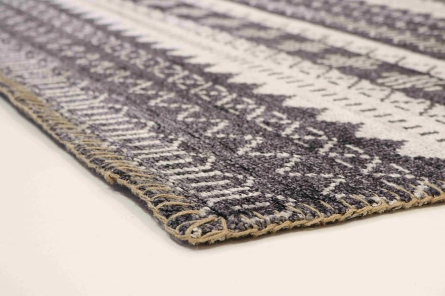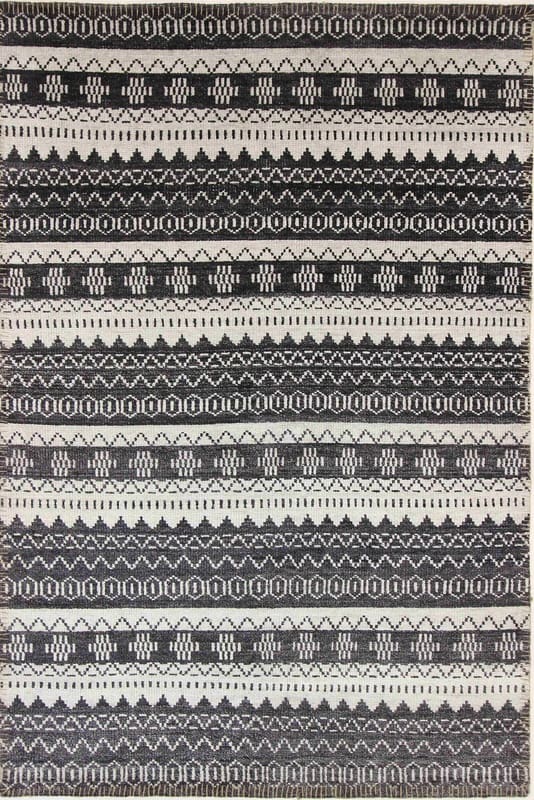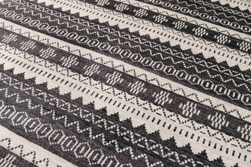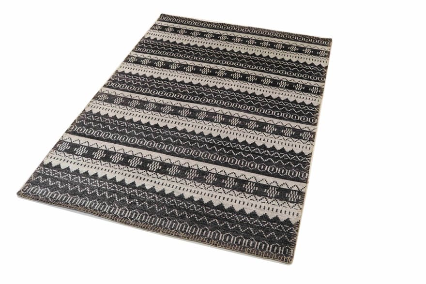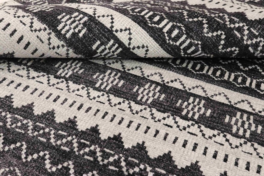 Designer-Teppich MODERN-IKAT | Knotendichte: 90.000 Knoten/m² | Material: Wolle und Baumwolle | Größe: 247×164 cm | Farbe: Schwarz/Grau | Alter: Neu | Zustand: Hervorragend | Verarbeitung: Handgeknüpft | Ursprung: Indien | Dicke: ca. 8 mm | Gewicht: ap. 10 kg
