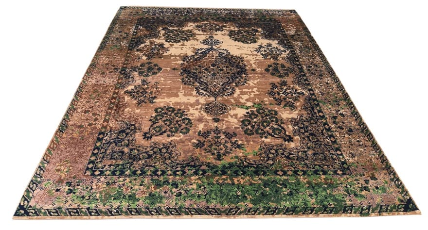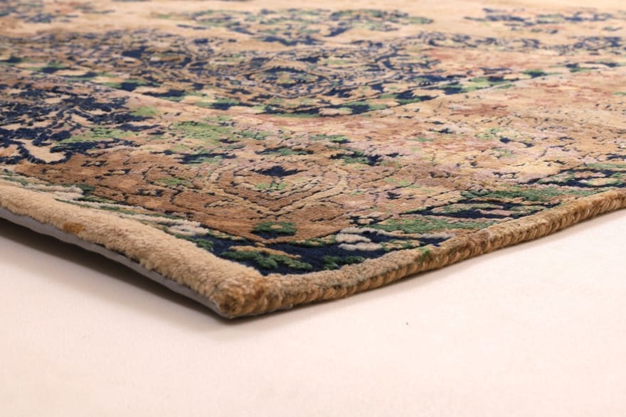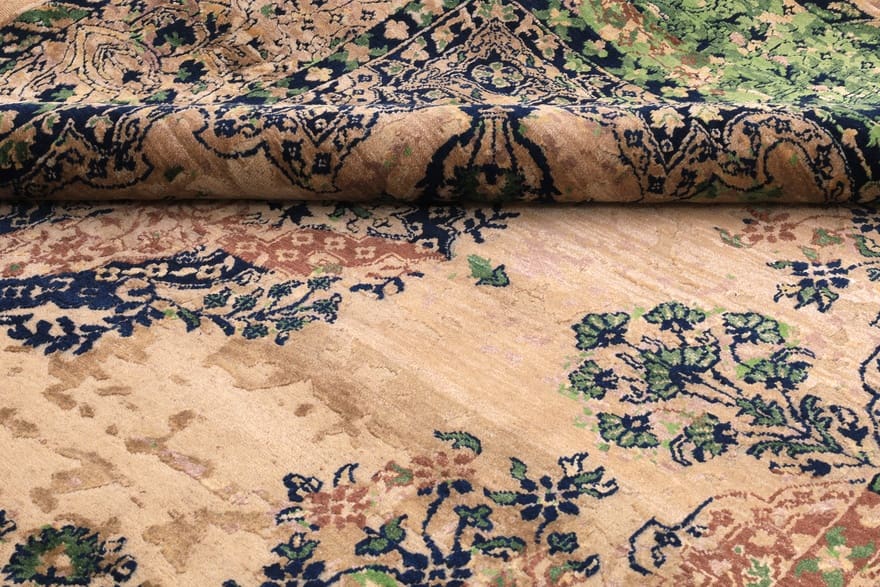 Der Teppich wird aus hochwertigen, natürlichen Materialien hergestellt, die zu seinem extravaganten Aussehen und seiner hohen Verarbeitungsqualität beitragen. Die Verwendung von Schurwolle sorgt nicht nur für eine weiche und angenehme Haptik, sondern macht das Material auch äußerst widerstandsfähig gegen Abnutzung und Verschmutzung. Darüber hinaus trägt die handgeknüpfte Technik zur Langlebigkeit des Teppichs bei. Jeder Teppich ist ein Unikat, das durch die Individualität der Handarbeit geprägt ist. Die Knotendichte ist bemerkenswert hoch, was bedeutet, dass jedes Muster und jede Farbnuance detailgenau und klar zur Geltung kommt.