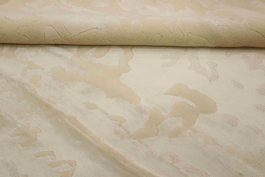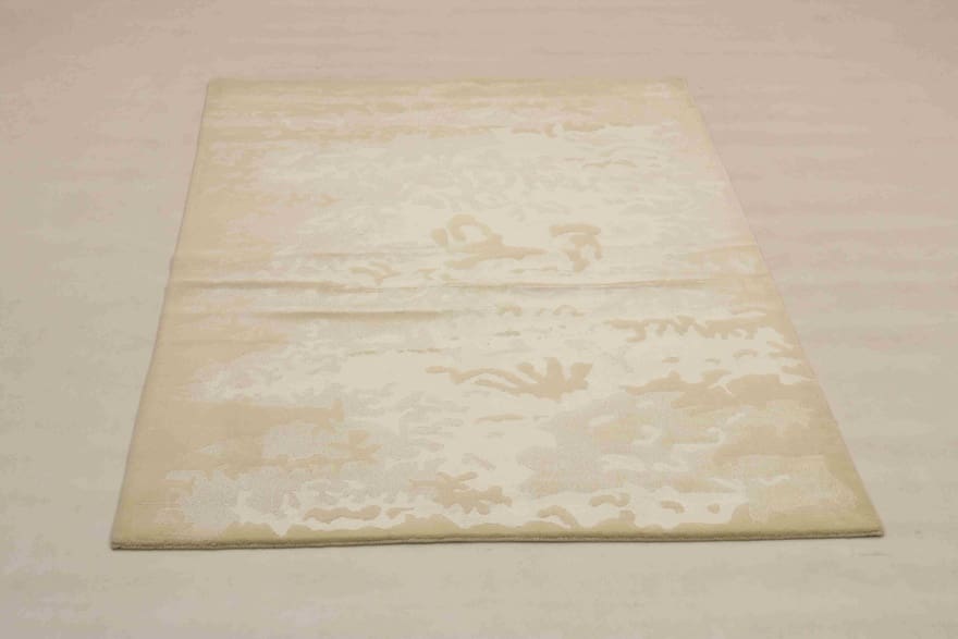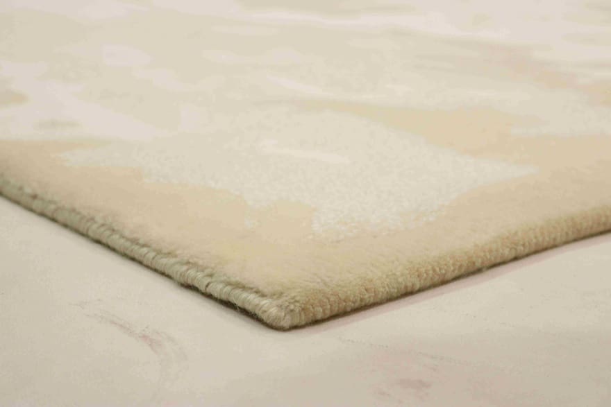 Moderner Nepal Teppich | Knotendichte: 160.000 – 200.000 Knoten/m² | Material: Hochwertige Schurwolle und Bambusseide | Größe: 202×143 cm | Zustand: Neu | Ursprung: Indien | Verarbeitung: Handgeknüpft | Farbe: Weiß/Beige | Dicke: ca. 10 mm | Gewicht: ca. 10 kg
