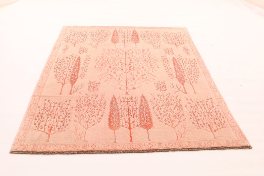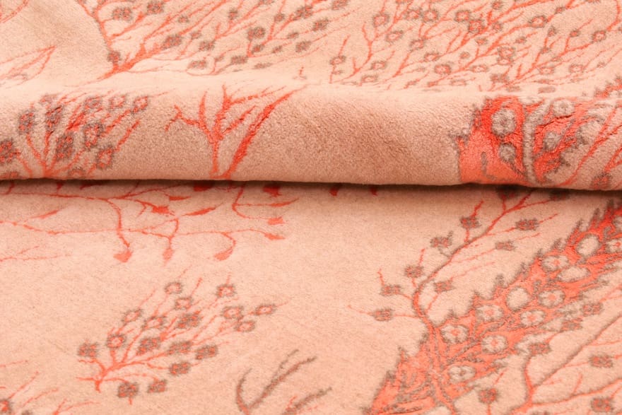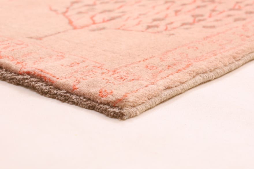 Designer-Teppich | Knotendichte: 160.000 – 200.000 Knoten/m² | Material: Wolle mit Bambusseide | Größe: 241×165 cm | In neuem Zustand | Ursprung: Indien | Dicke: ca. 10 mm | Farbe: Rot/Orange | Verarbeitung: Loom Handgeknüpft