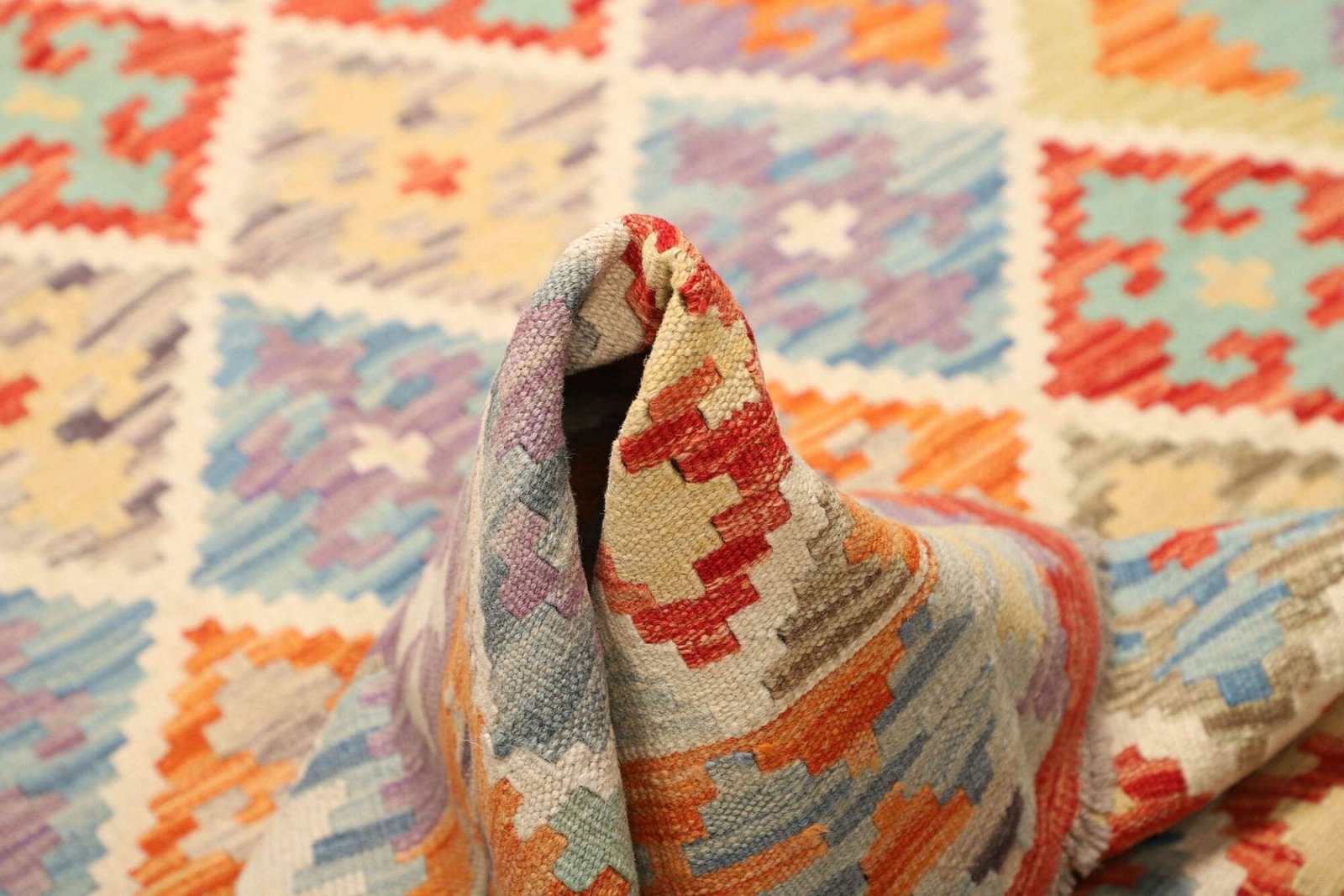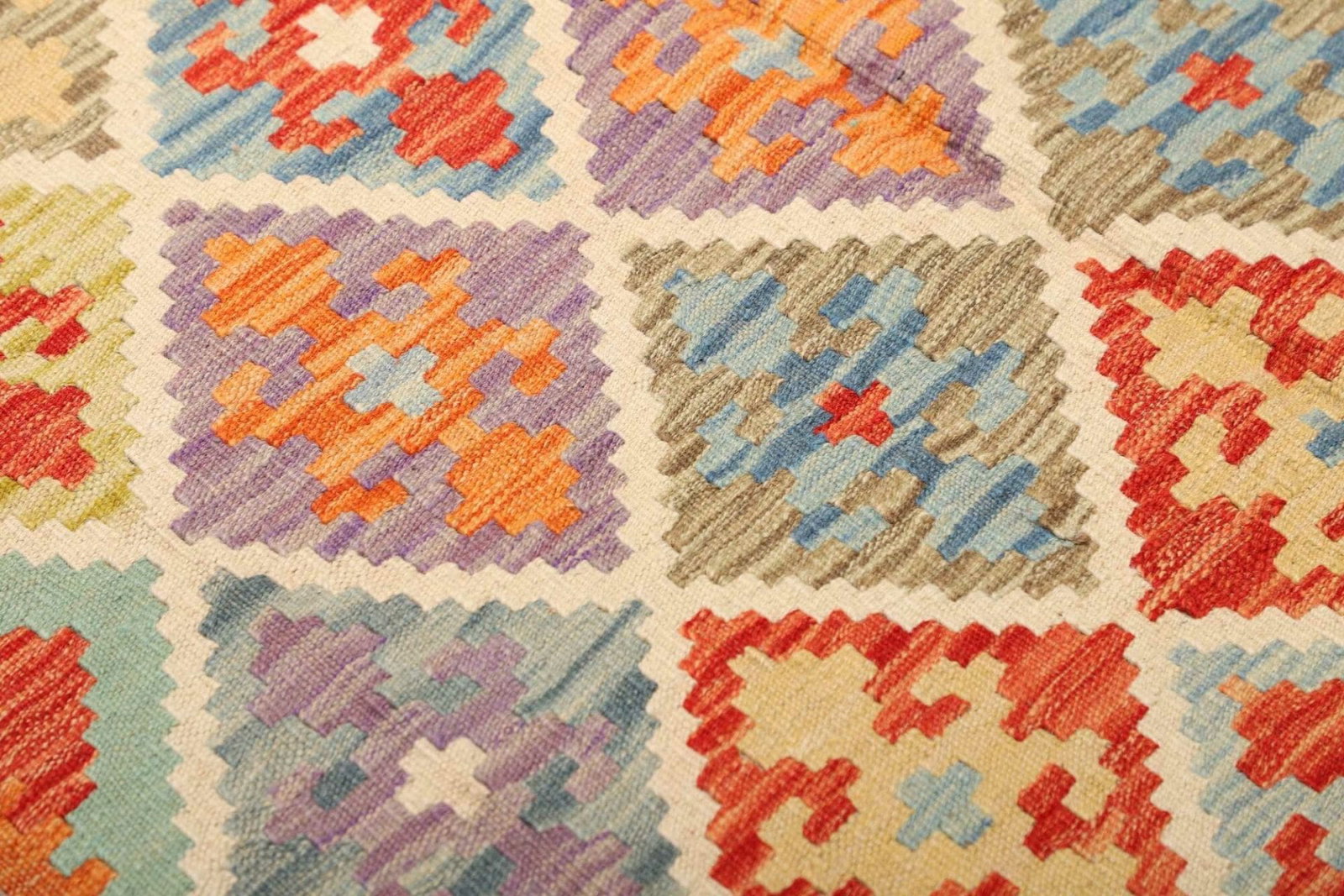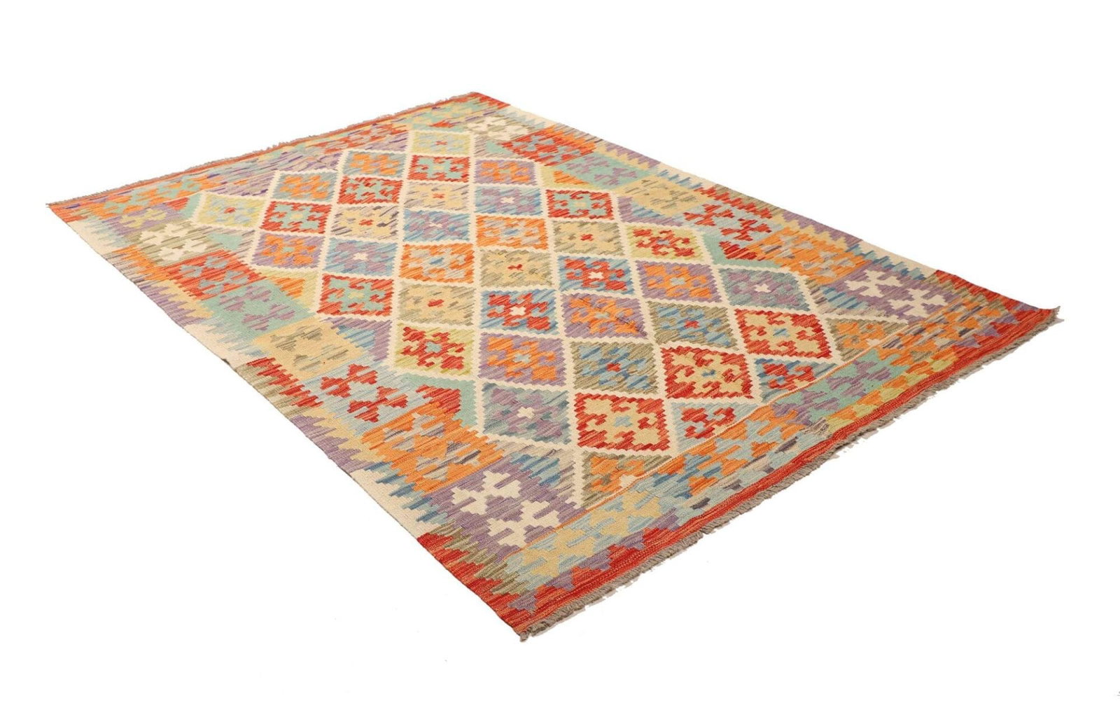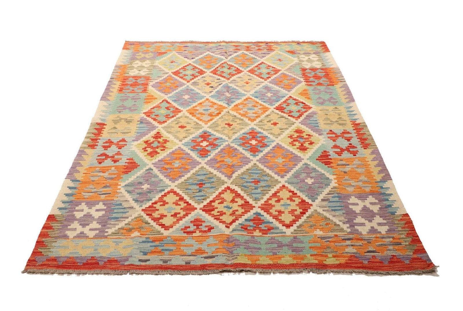 Kelim Teppich | Knotendichte: ca. 200.000 Knoten/m² | Material: 100% Schurwolle, Kette aus 100% Baumwolle | Größe: 151 x 205 cm | Zustand: Handgewebt | Herkunft: Pakistan | Florhöhe: ca. 5 mm