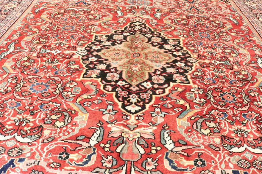 Antiker Mohajeran Teppich | Knotendichte: 160.000 – 200.000 Knoten/m² | Material: Wolle (Flor), Baumwolle (Kette) | Größe: 427×321 cm | Farbe: Rot/Orange | Rechteckige Form | Herkunft: Iran / Persien | Handgeknüpft | Alter: Antik | Dicke: ca. 10 mm | Gewicht: ca. 40 kg