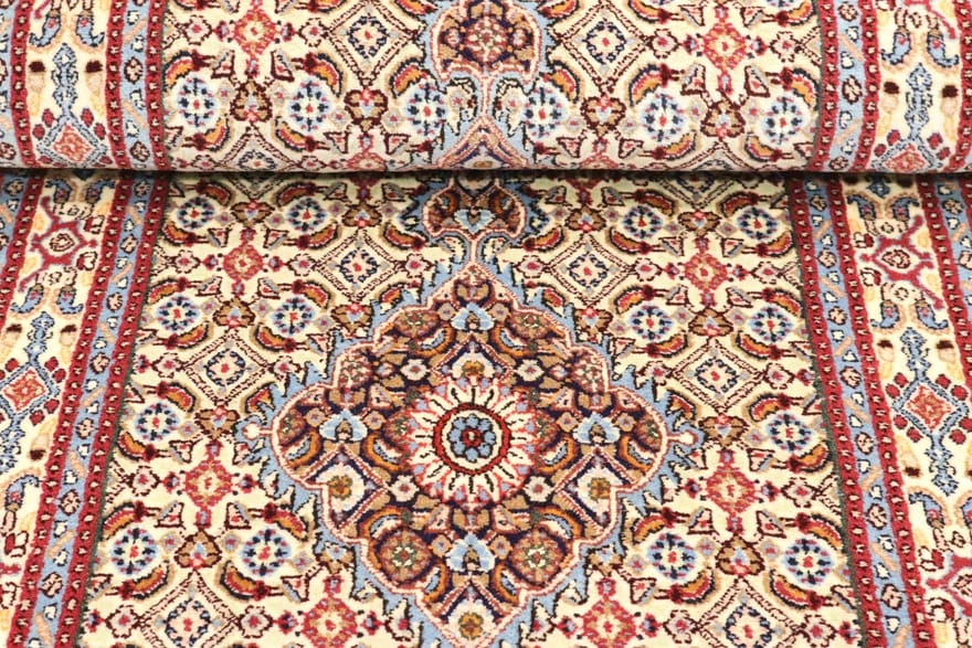 Das Medaillon-Muster des Moud Orientteppichs ist besonders hervorzuheben. Solche Designs sind in der orientalischen Teppichkunst weit verbreitet und symbolisieren oft Harmonie und Ausgewogenheit. Medaillons sind häufig zentrale Elemente in der Teppichgestaltung und verleihen dem Gesamtbild eine ansprechende Symmetrie. Durch die Verwendung von leuchtenden Farben und detaillierten Motiven bietet dieser Teppich nicht nur einen Blickfang, sondern auch einen Ausdruck von Kunstfertigkeit, die traditionell mit der Teppichknüpfung verbunden ist.