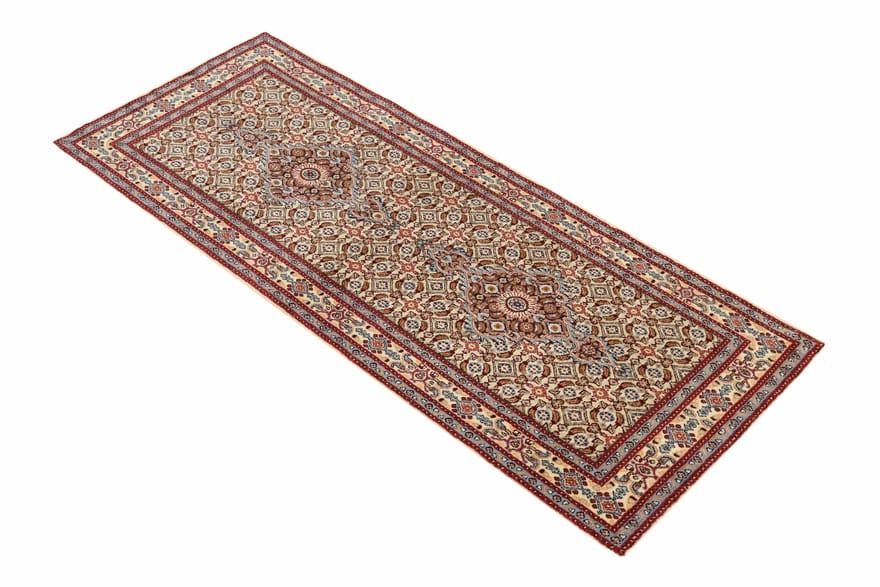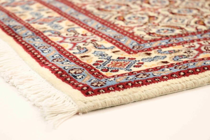 Handgeknüpfter Moud-Teppich | Knotendichte: 320.000 – 360.000 Knoten/m² | Material: Wolle und Seide | Größe: 199×80 cm | Farbe: Weiß/Beige | Zustand: Neu | Ursprung: Iran / Persien | Form: Läufer | Dicke: ca. 8 mm | Gewicht: ca. 6 kg