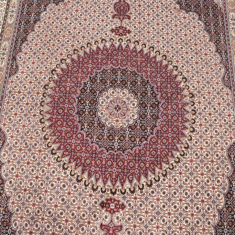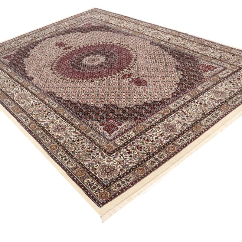 Handgewebter Moud-Teppich | Knotendichte: 320.000 – 360.000 Knoten/m² | Material: Wolle, Seide, Baumwolle | Größe: 352×246 cm | Farbe: Weiß/Beige | Zustand: Neu | Herkunft: Iran / Persien | Verarbeitung: Handgeknüpft | Florhöhe: ca. 18 mm | Gewicht: ca. 30 kg