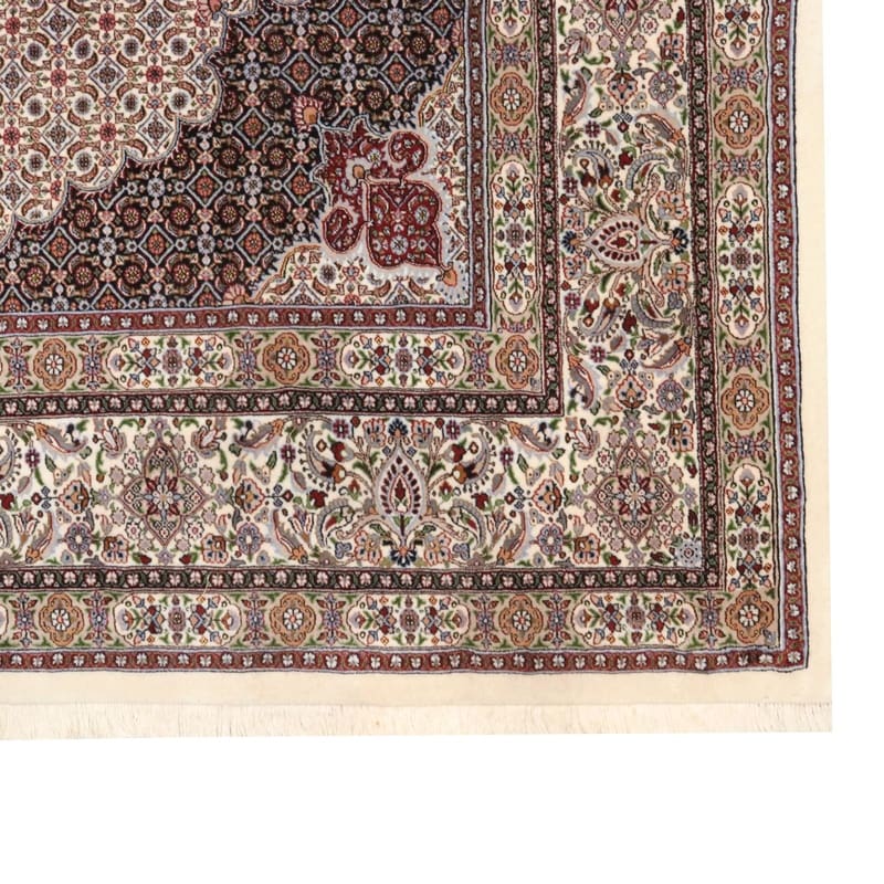 Der Moud Perserteppich besteht aus einer harmonischen Kombination von Wolle und Seide. Wolle verleiht dem Teppich Strapazierfähigkeit und Wärme, während die Seide ihm einen luxuriösen Glanz verleiht und die Farben lebendig erscheinen lässt. Die handgeknüpfte Technik macht jeden Teppich zu einem Unikat, da die Knotendichte und die Musterung von erfahrenen Kunsthandwerkern in sorgfältiger Arbeit erstellt werden. Dies garantiert nicht nur Qualität, sondern auch eine lange Lebensdauer des Teppichs, selbst bei starker Beanspruchung.