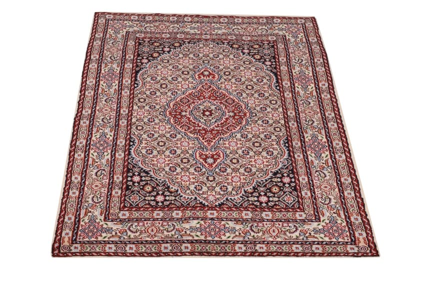 Das Medaillon-Muster des Moud-Teppichs ist ein klassisches Design, das tief in der persischen Teppichtradition verwurzelt ist. Medaillons symbolisieren oft die Harmonie und den inneren Frieden, was diesen Teppich zu einem idealen Element für jeden Raum macht. Das Zusammenspiel der Farben und die komplexe Anordnung der Muster ziehen die Blicke auf sich und schaffen eine einladende Atmosphäre.
