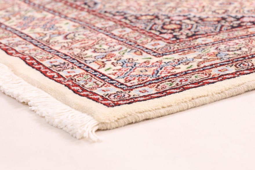 Der Moud-Teppich zeichnet sich durch hochwertige Materialien und eine exquisite Verarbeitung aus. Er wird aus feinen Schafswollen hergestellt, die für ihre Langlebigkeit und ihren Tragekomfort bekannt sind. Die Verwendung von natürlichen Farbstoffen sorgt dafür, dass die Farben lebendig und strahlend bleiben. Durch die handgeknüpfte Technik hat dieser Teppich eine hohe Knotendichte, die ihm nicht nur eine besondere Strapazierfähigkeit verleiht, sondern auch ein angenehmes Laufgefühl bereitet. Jedes Knoten wird von erfahrenen Kunsthandwerkern mit großer Sorgfalt erstellt, was die Qualität des Teppichs garantiert.